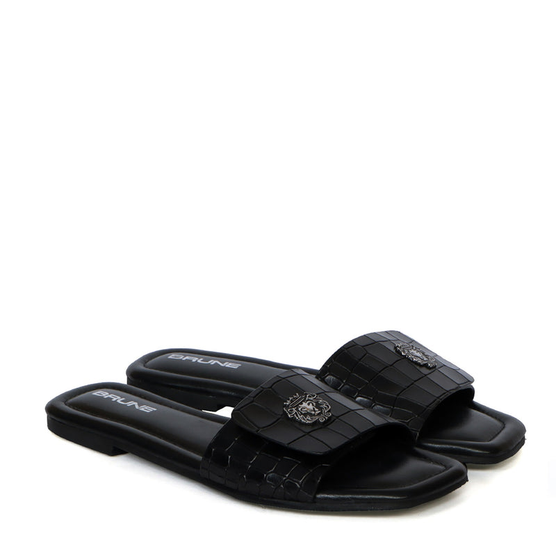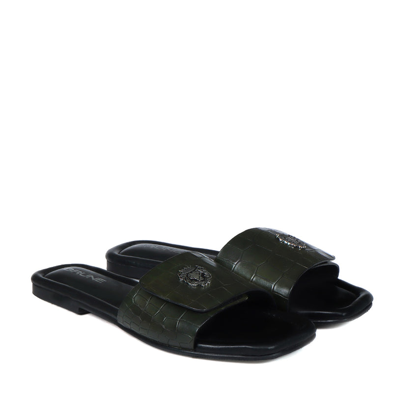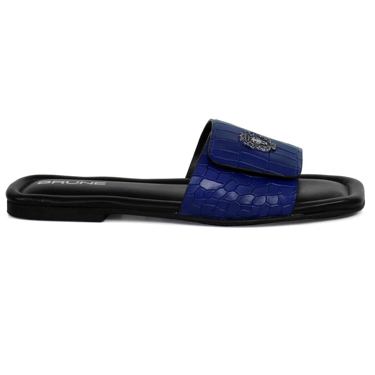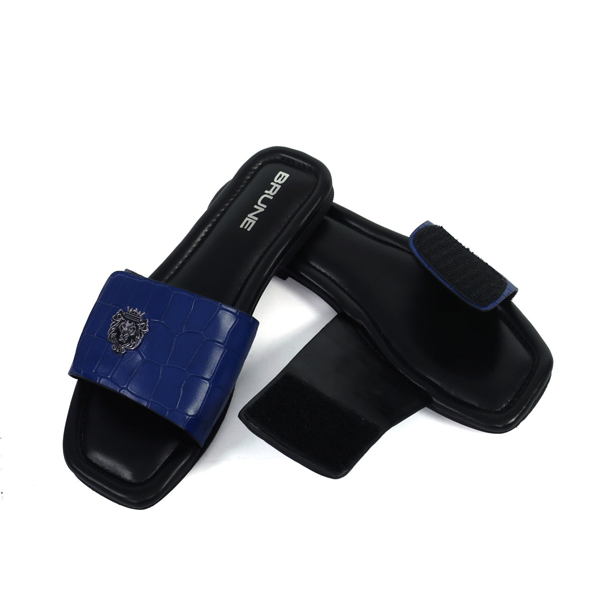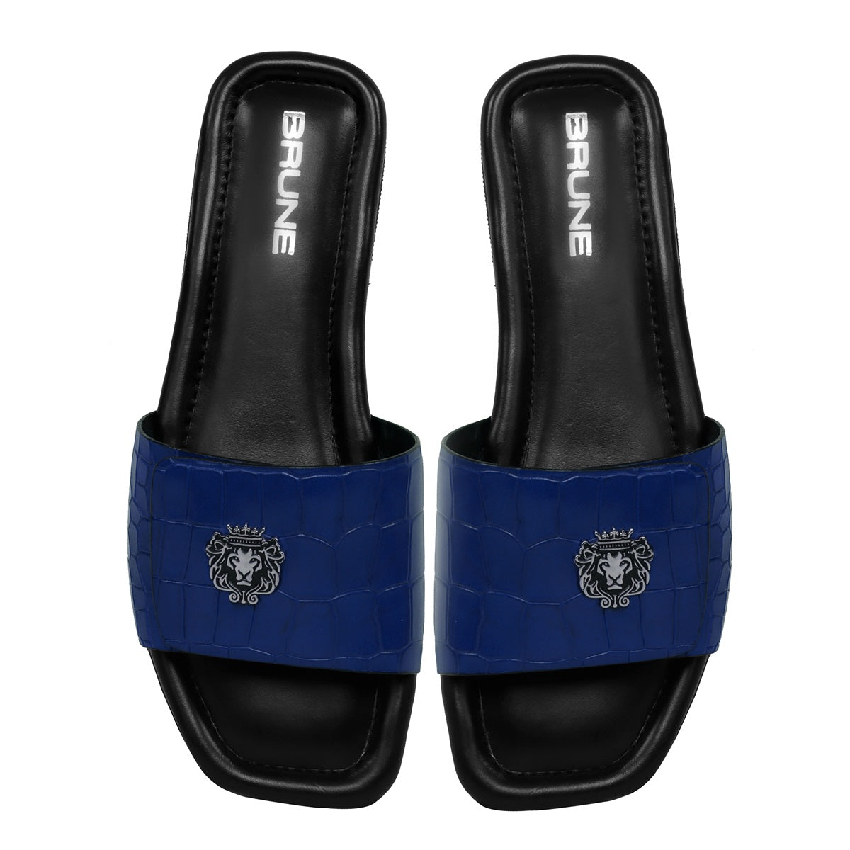 The croco deep cut textured leather slide in slipper from Brune & Bareskin is perfect for those who seek a stylish yet comfortable shoe. Featuring a Velcro adjustable strap, silver lion logo, and handmade blue finish, this slipper is both lightweight and soft, making it ideal for all-day wear. Anti-Skid rubber outer sole ensures the perfect walking grip. Carry these with Jeans, Shorts and other casual wears to be style leader. You can get it made in your favorite color with our Bespoke services.
