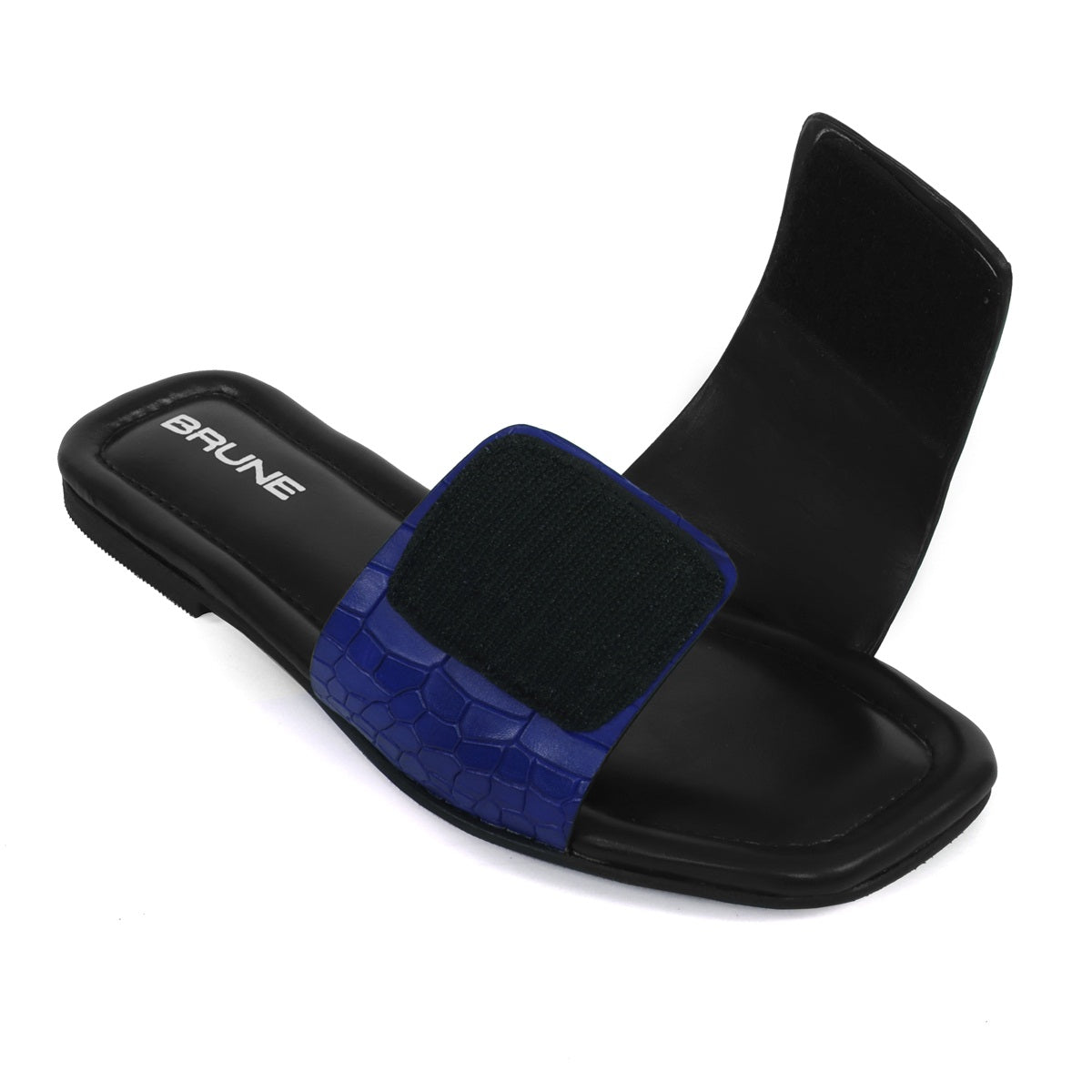 Women's Freeway Slide In Slipper Velcro Adjustable Strap Blue Croco Deep Cut Textured Leather