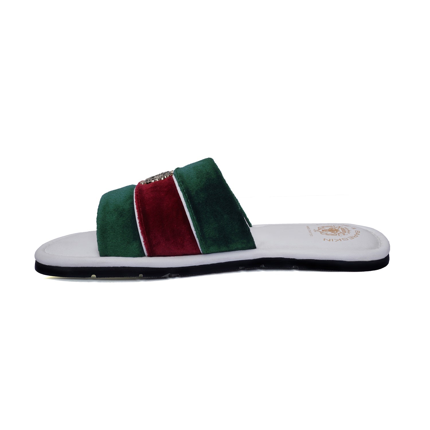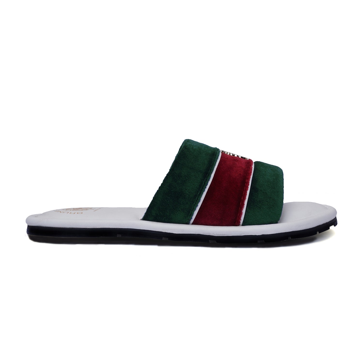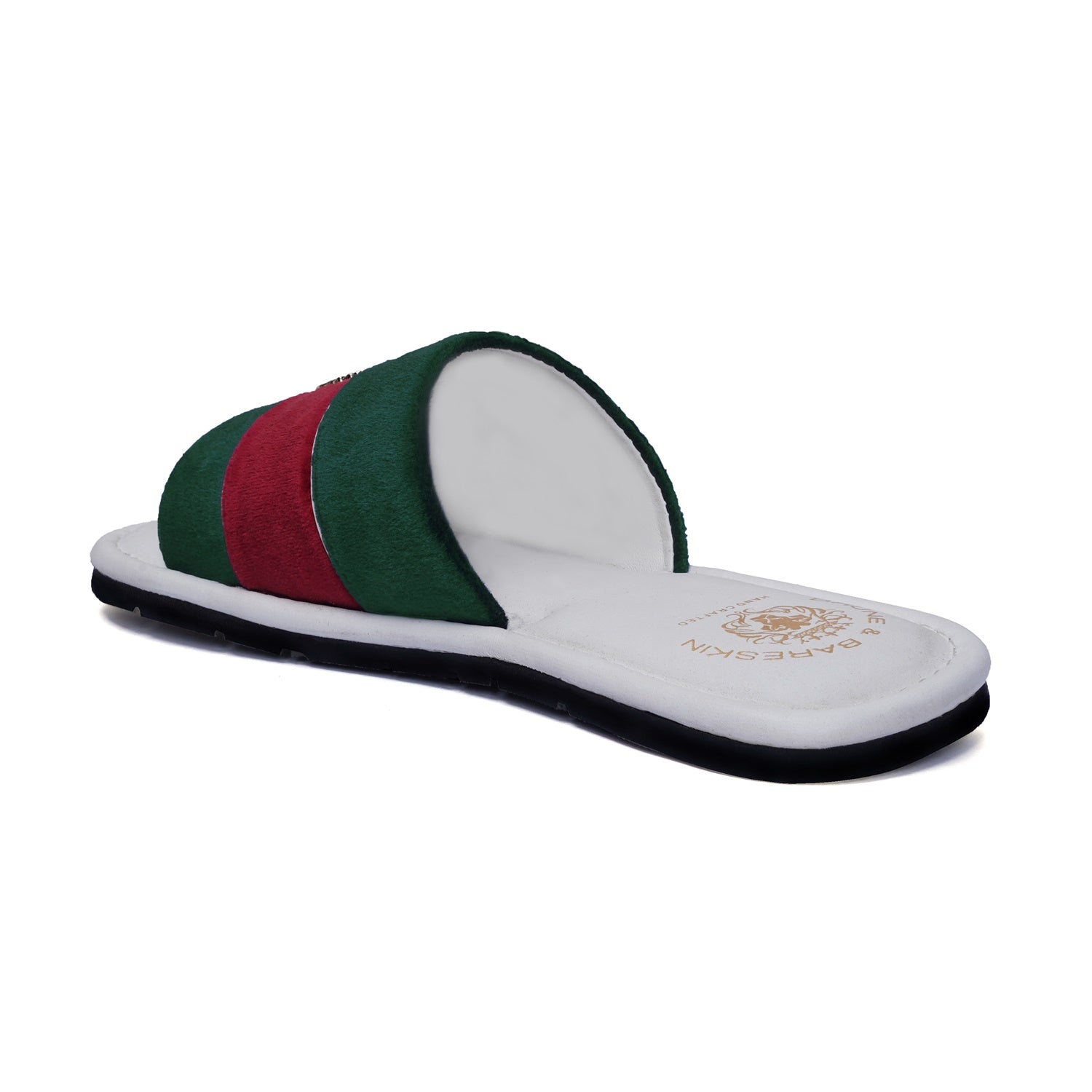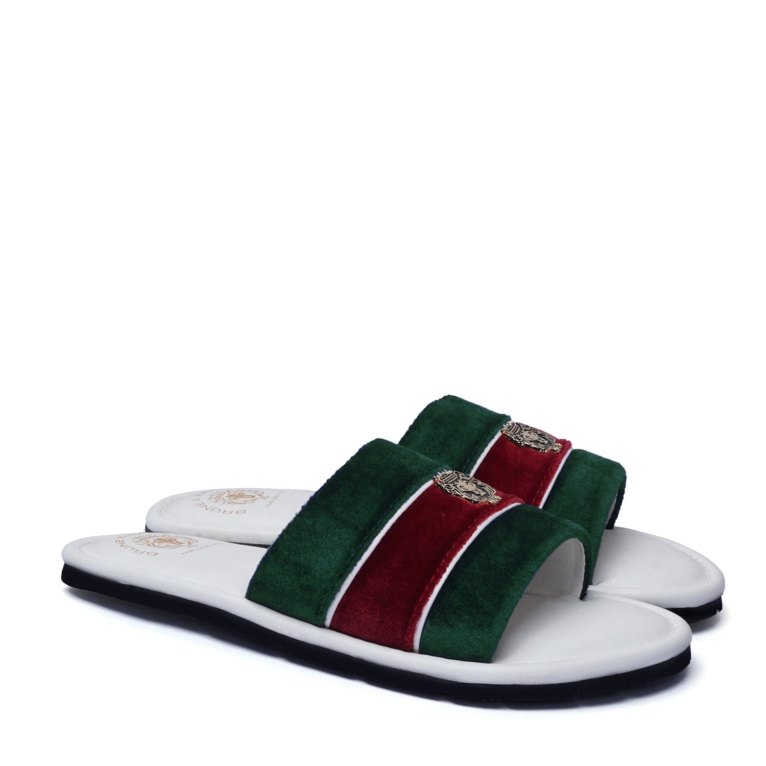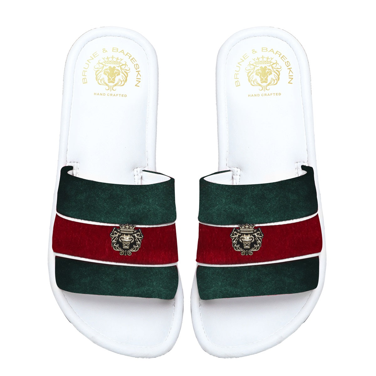 Women's Green & Red Velvet Strap White Leather Slide-in Slippers by BRUNE & BARESKIN