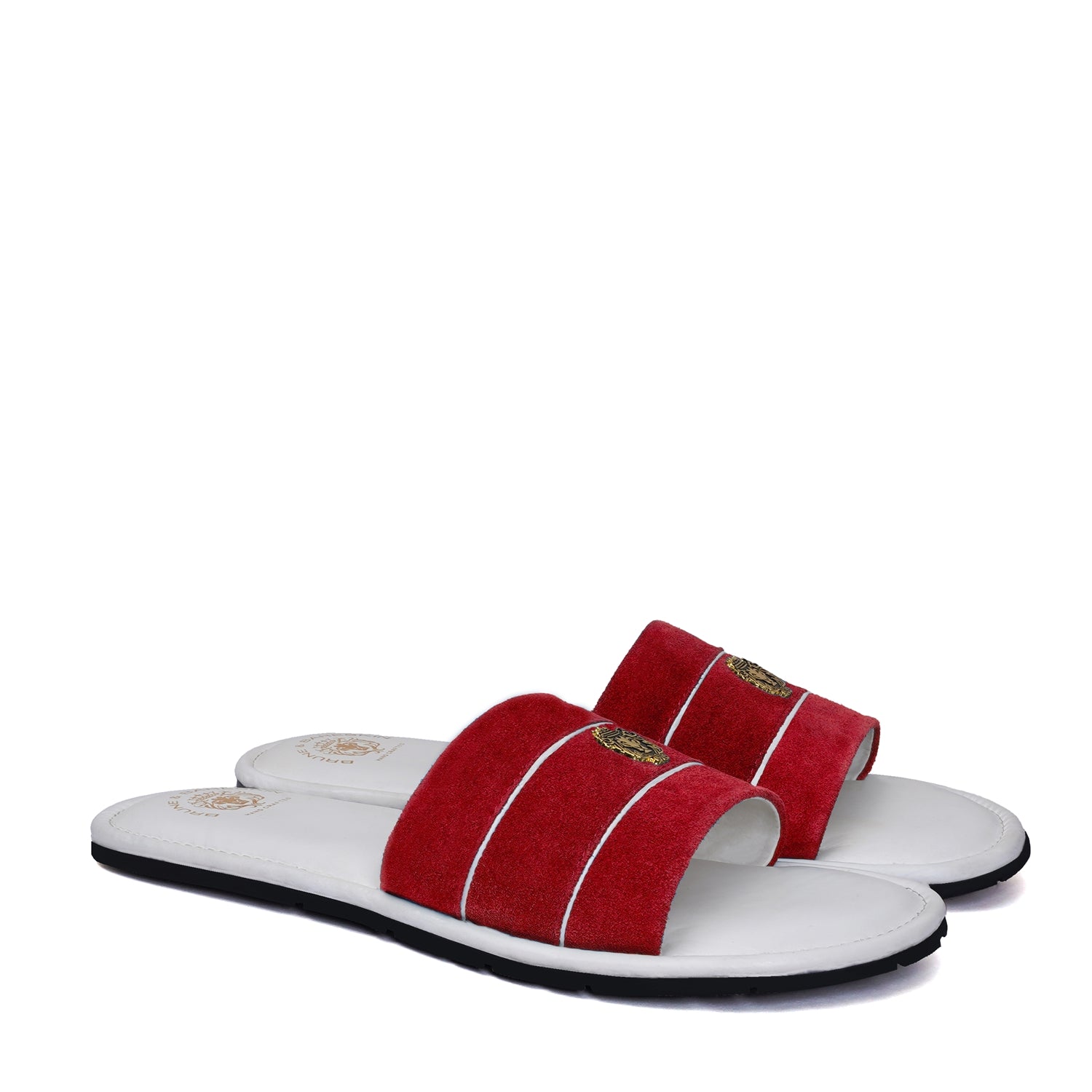Women's Red Velvet Strap White Leather Slide-in Slippers by BRUNE & BARESKIN
