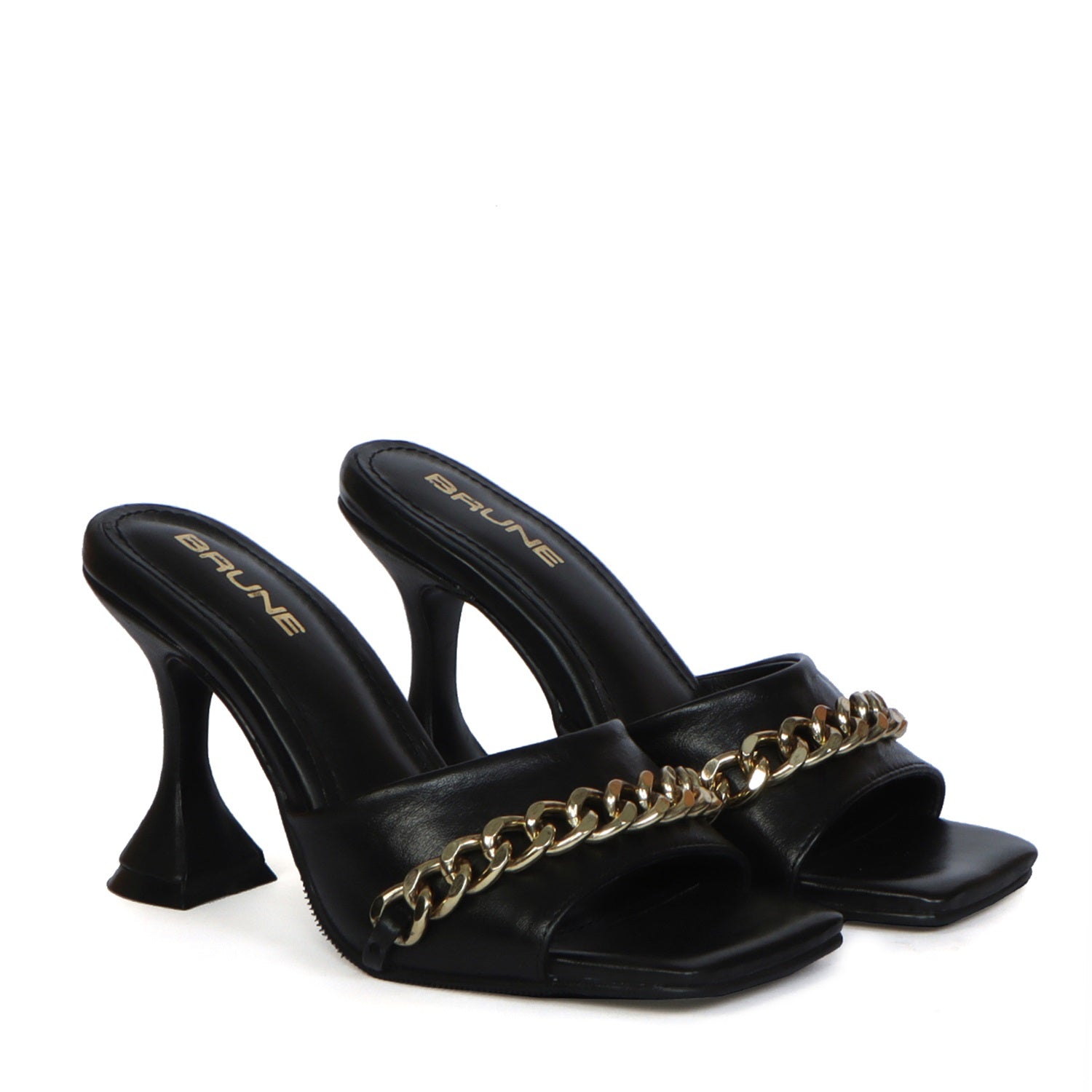 Women's Sandal With Golden Chain Embellishment Open Square Toe in Black Leather