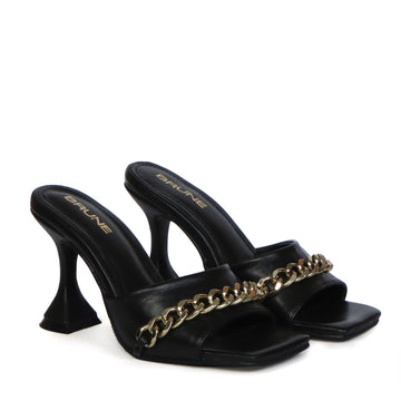 Let your feet make a statement with this luxurious black leather sandal from Brune & Bareskin. An open square toe and fluted heel spill into a golden finish chain embellishment, creating a look that is stylishly sophisticated and fashionably fierce. The perfect addition to any wardrobe, mini lion logo under the sandal, this sandal's 90 mm heel will have you standing out from the crowd. Wear them with everything from pared-back suiting to special occasion dresses. Team yours with midi dresses or cropped denim to show them off. You can customize this pair in any of your favorite color with our bespoke services.