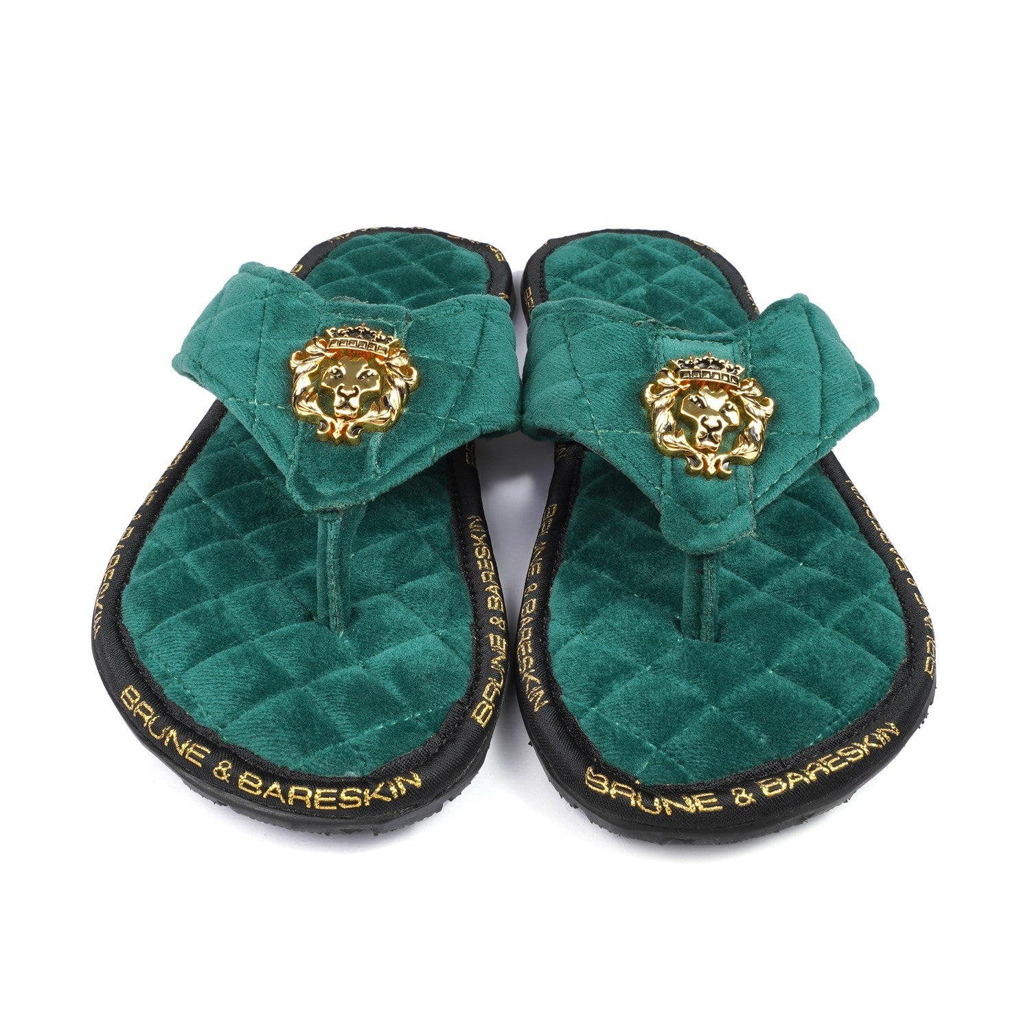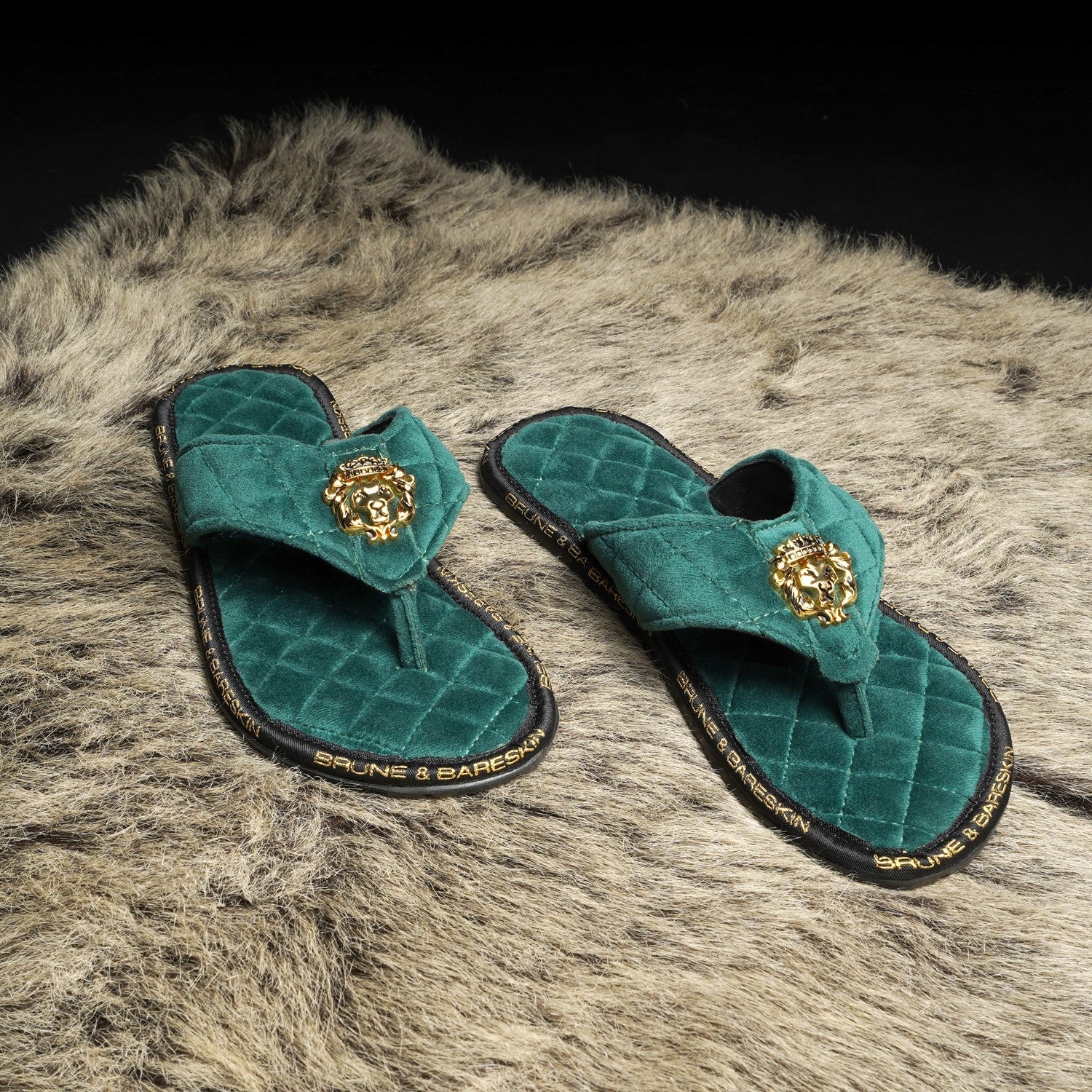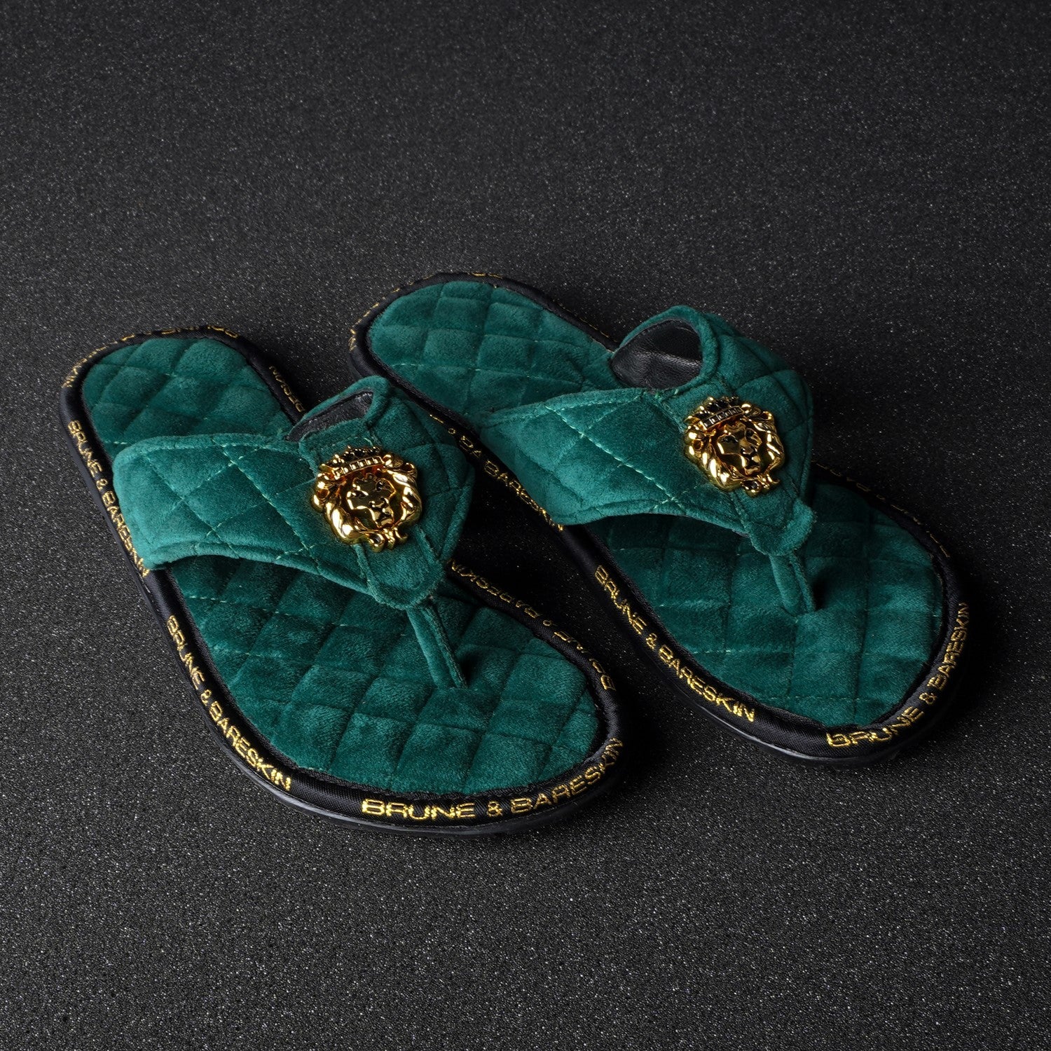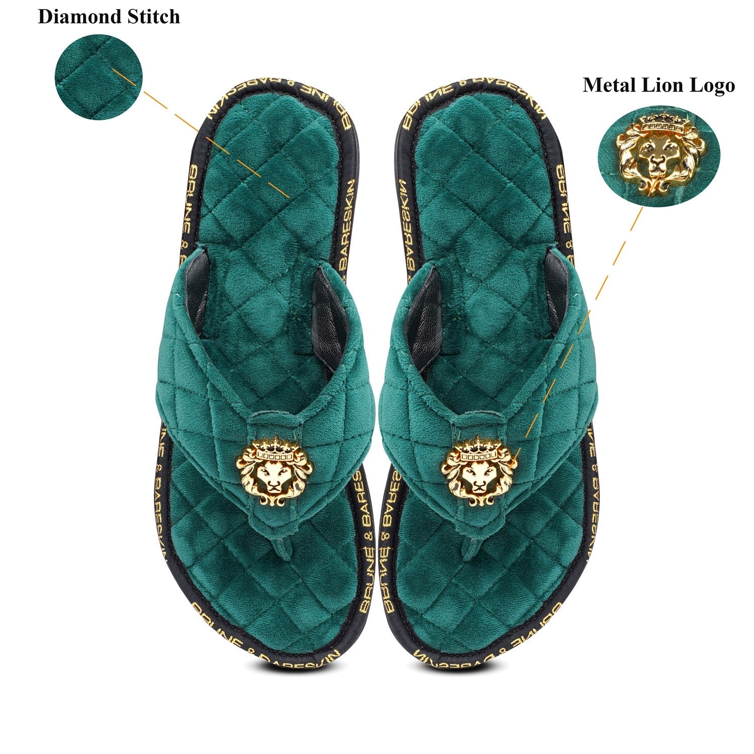 Women's V Strap Green Diamond Stitched 3D Lion Logo Velvet Slippers