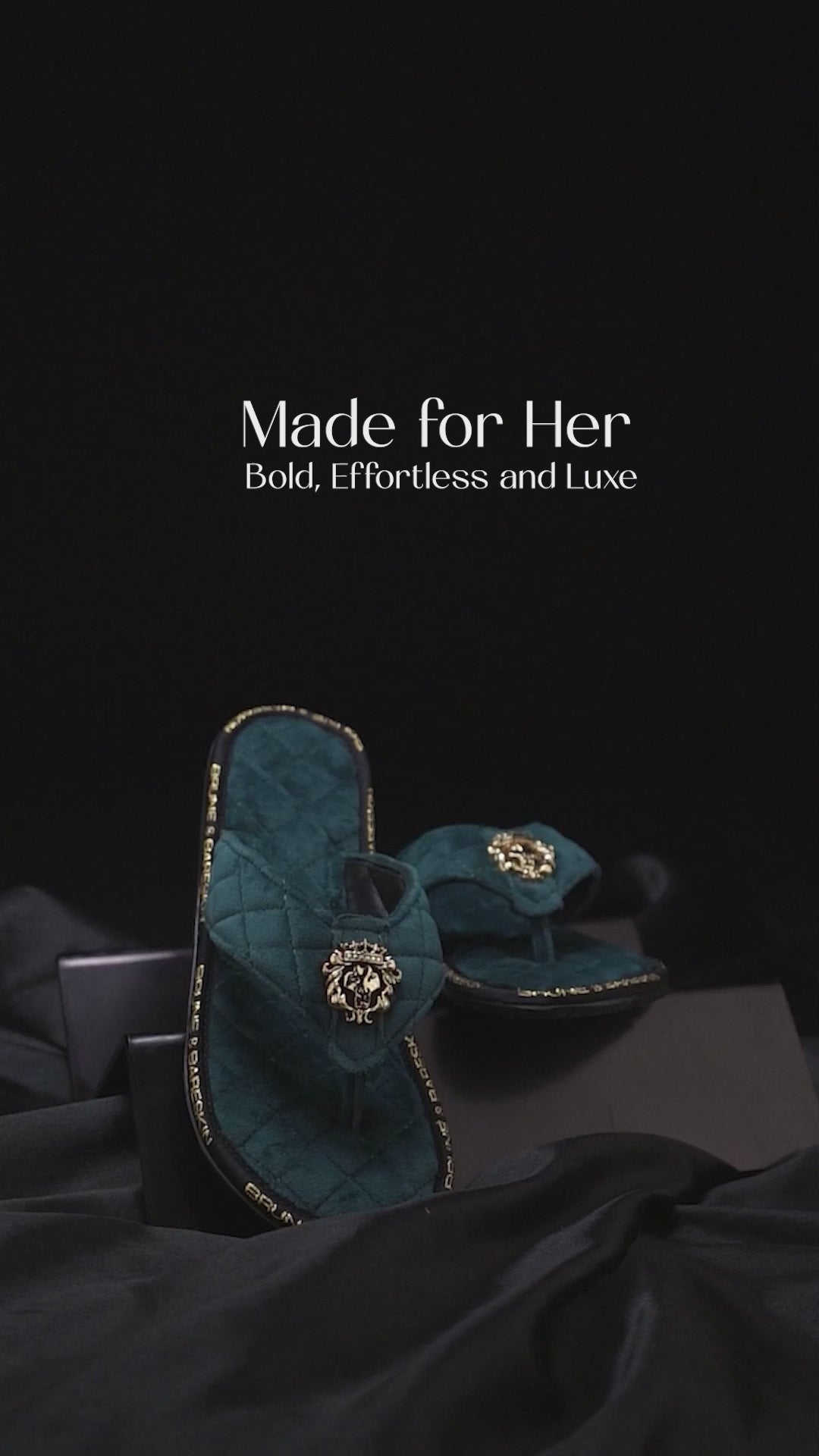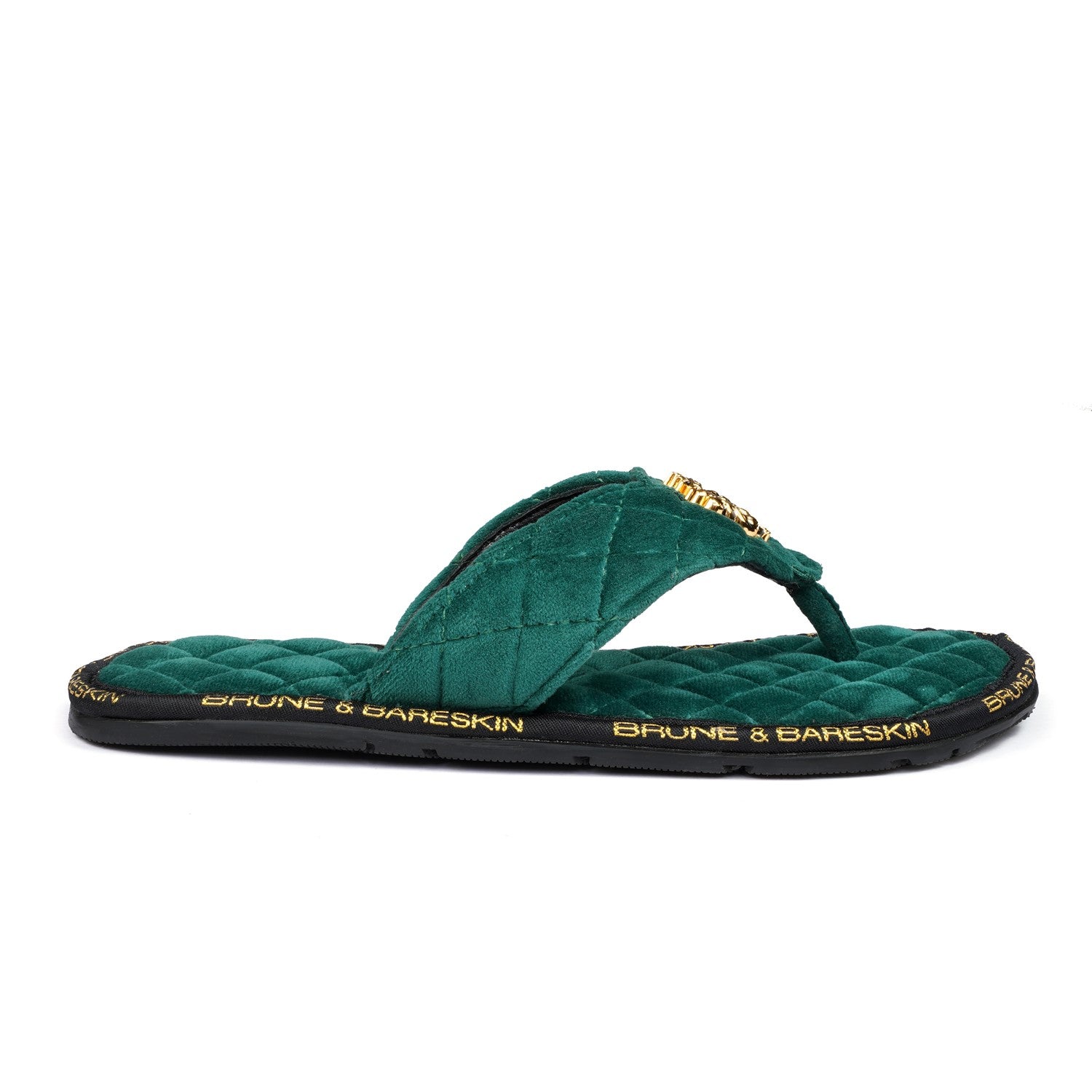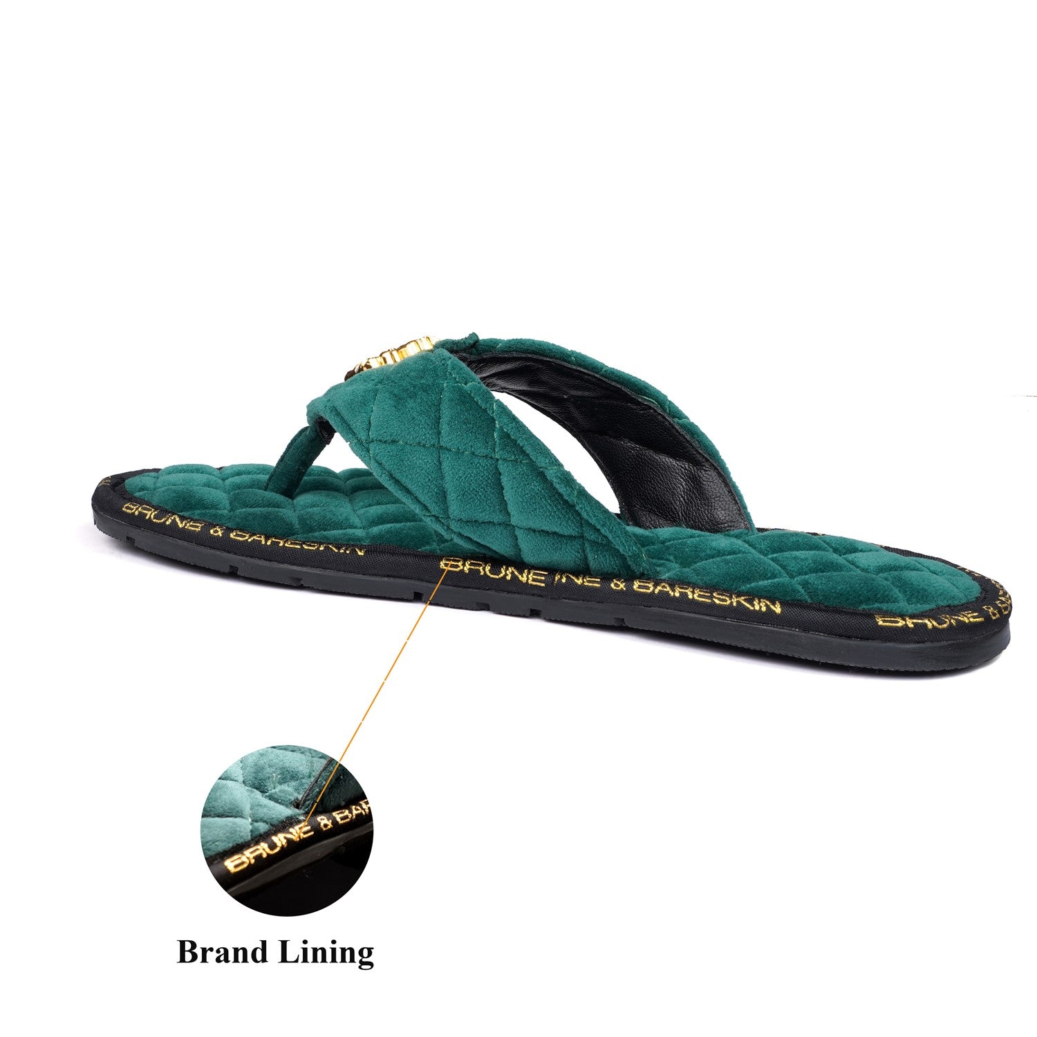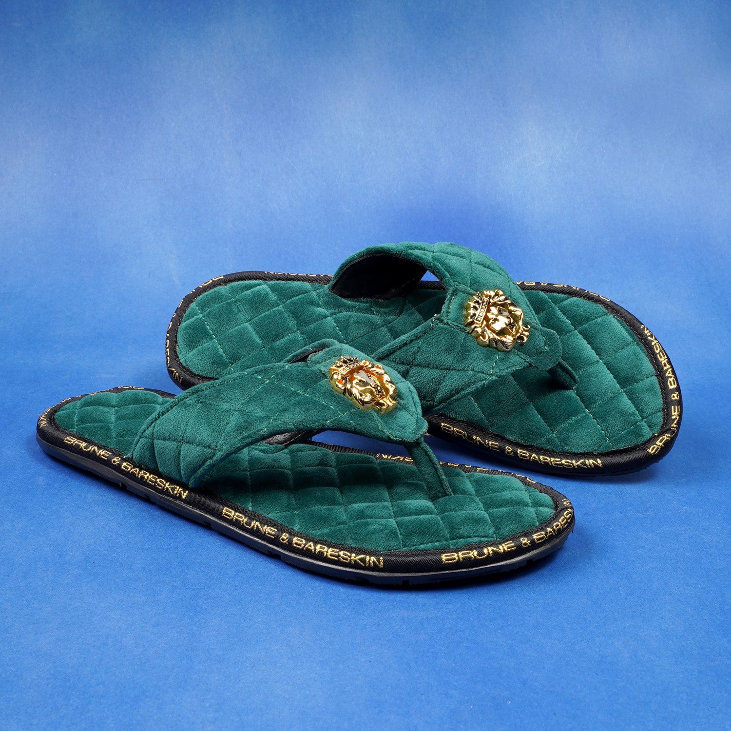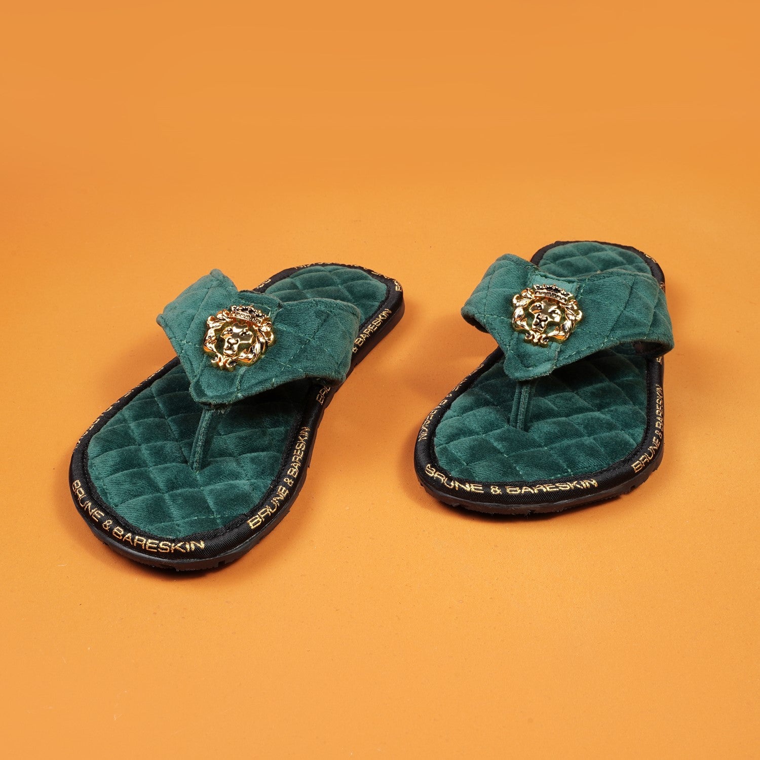 Women's V Strap Green Diamond Stitched 3D Lion Logo Velvet Slippers
