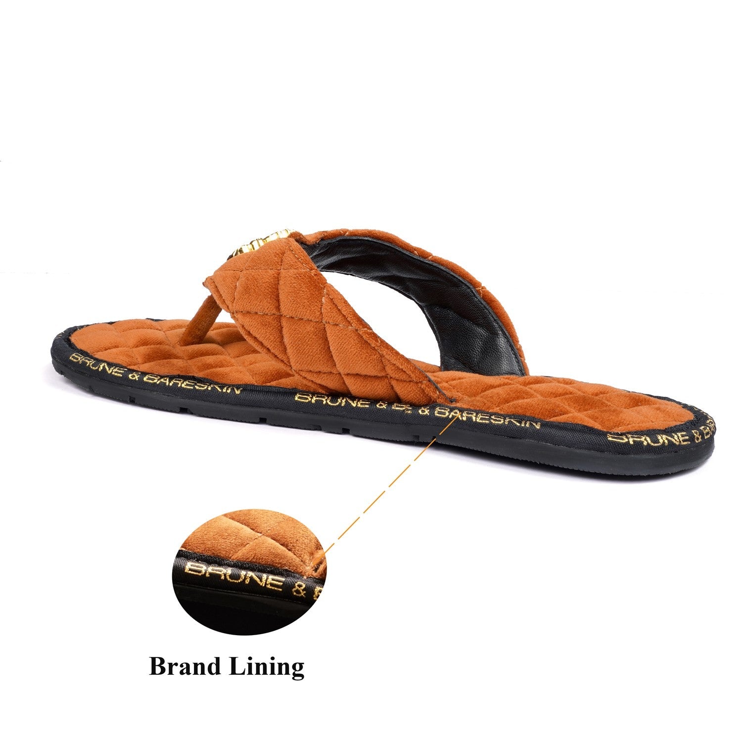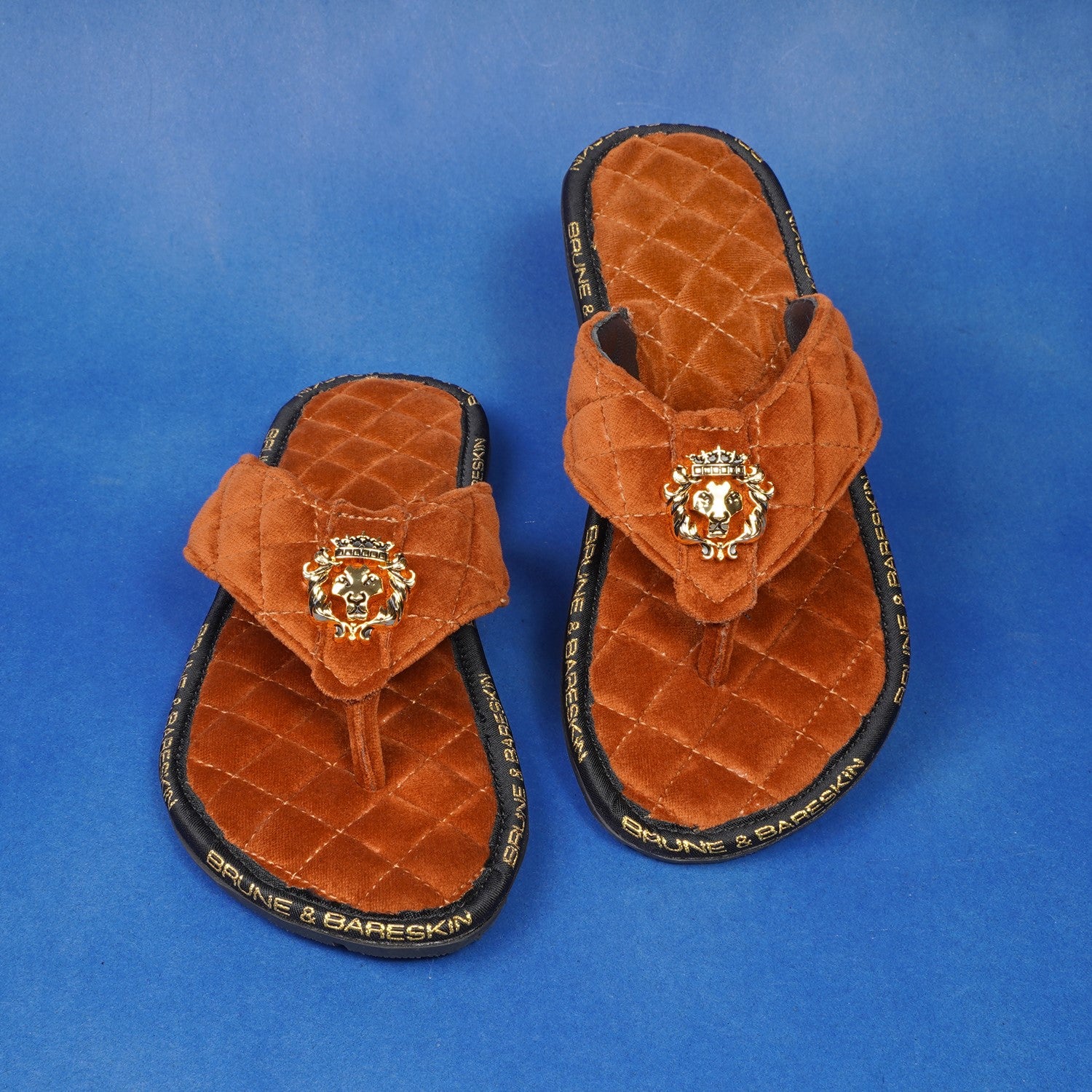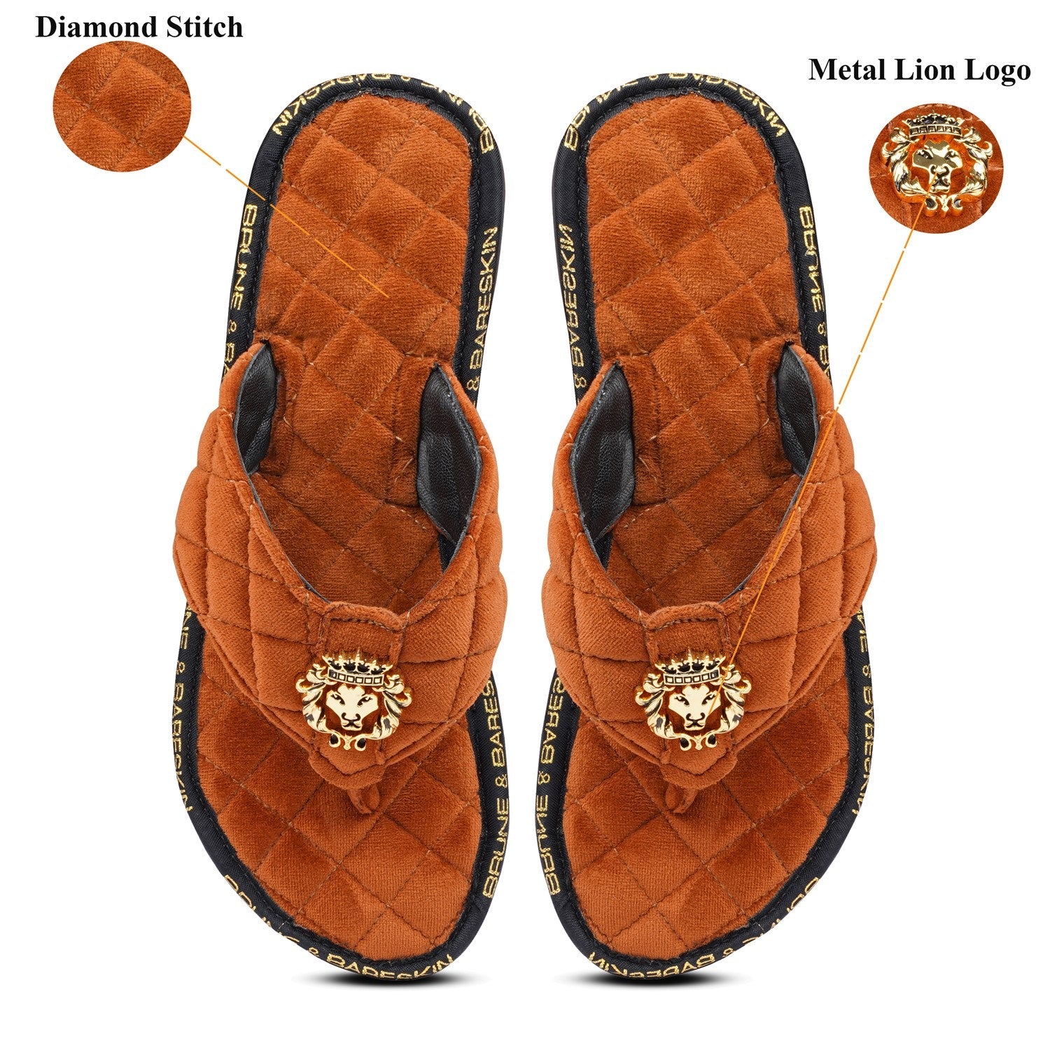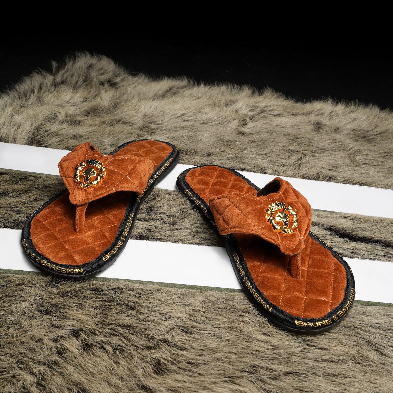 Super Comfy 3D Lion logo slippers, these super soft velvet base slippers are must have of the season. The gel injected memory foam base is designed to provide you comfort while walking. We use special layering techniques to keep the base cozy and retain it's shape. The wider straps with BRUNE & BARESKIN Lion Logo enhances the elegance further. Carry these with Jeans, Shorts, Capris and other casual wears to be style leader. Anti-Skid Rubber outer sole ensures the perfect walking grip.