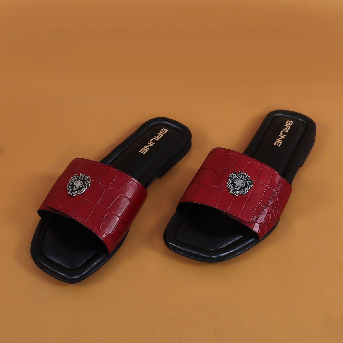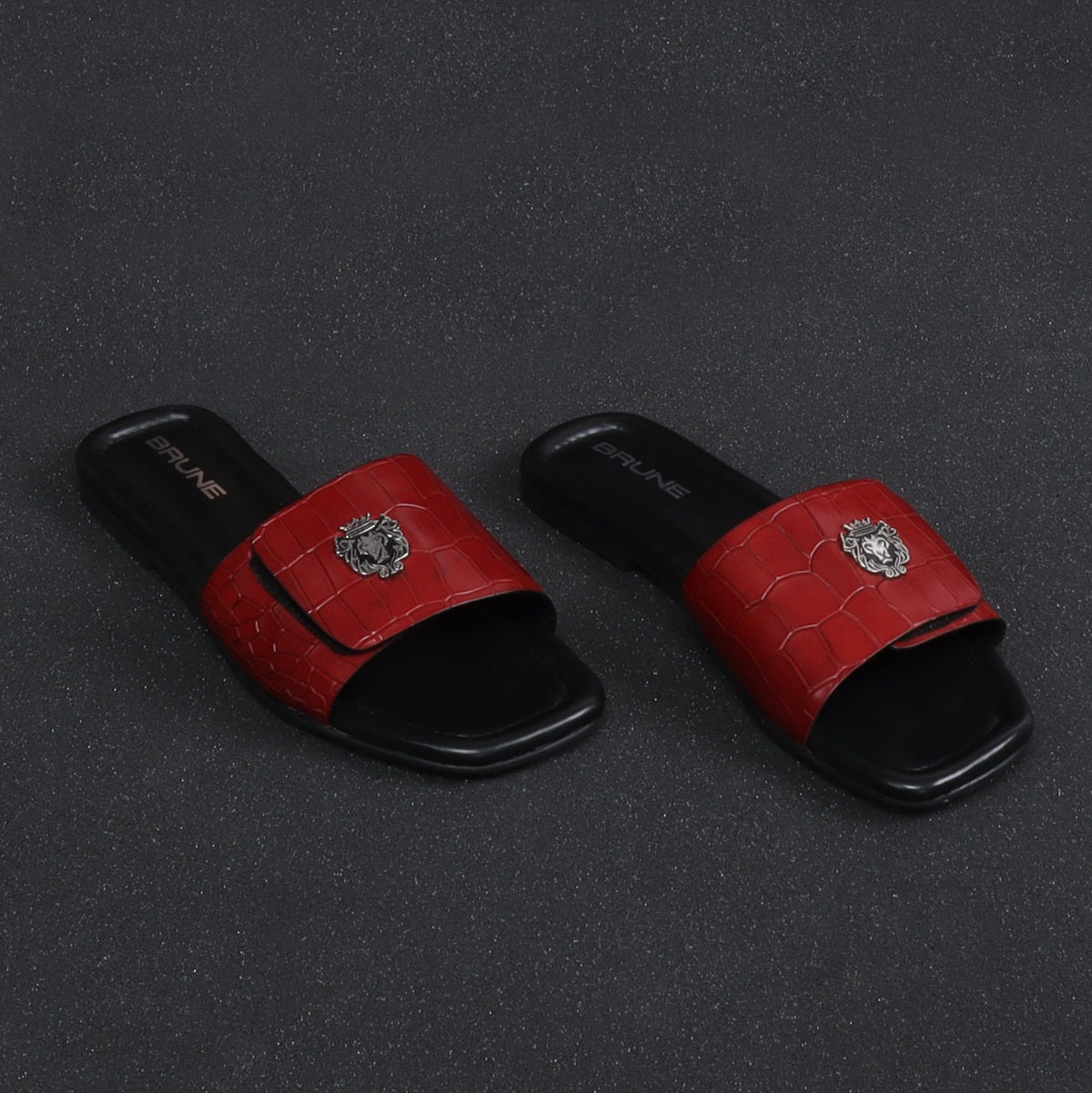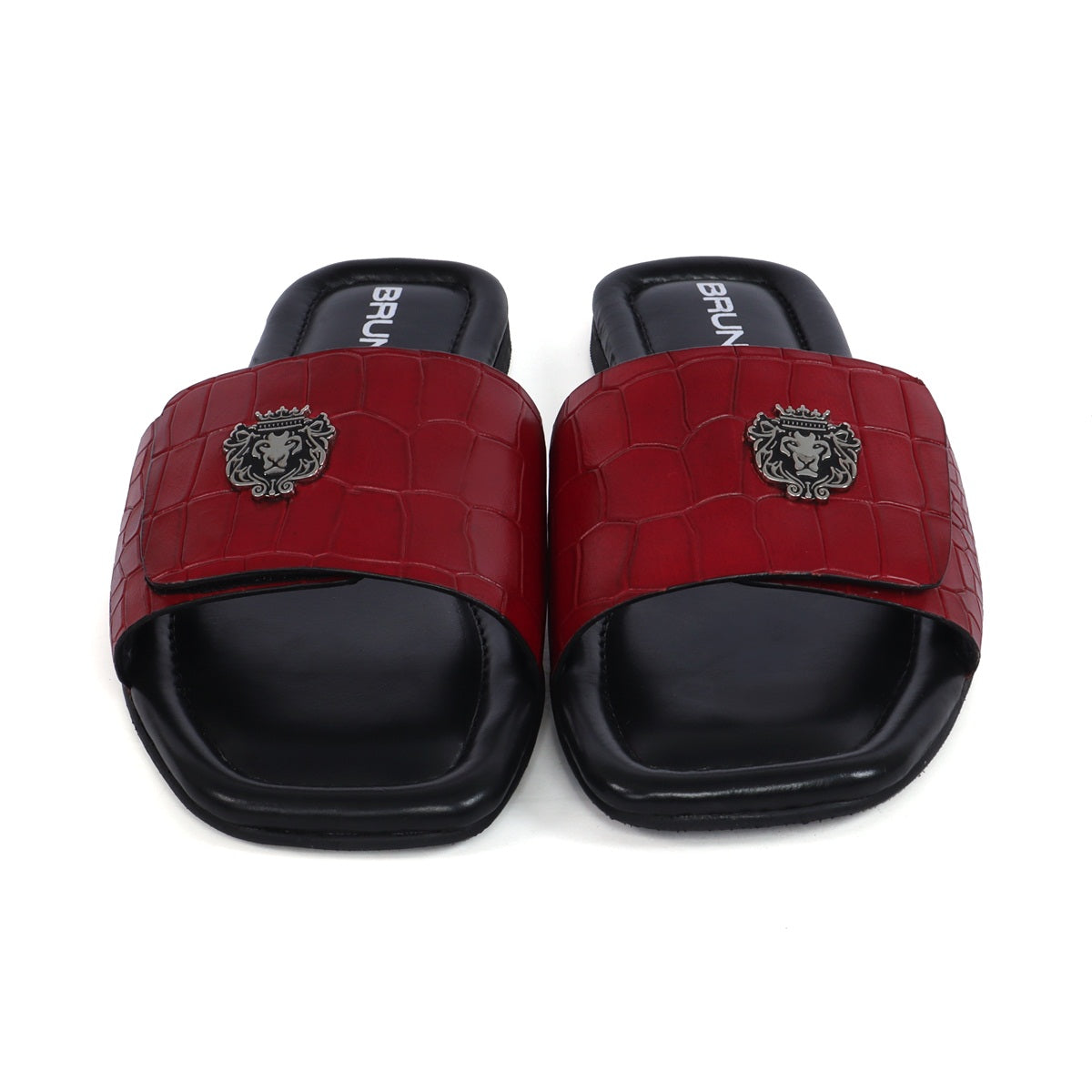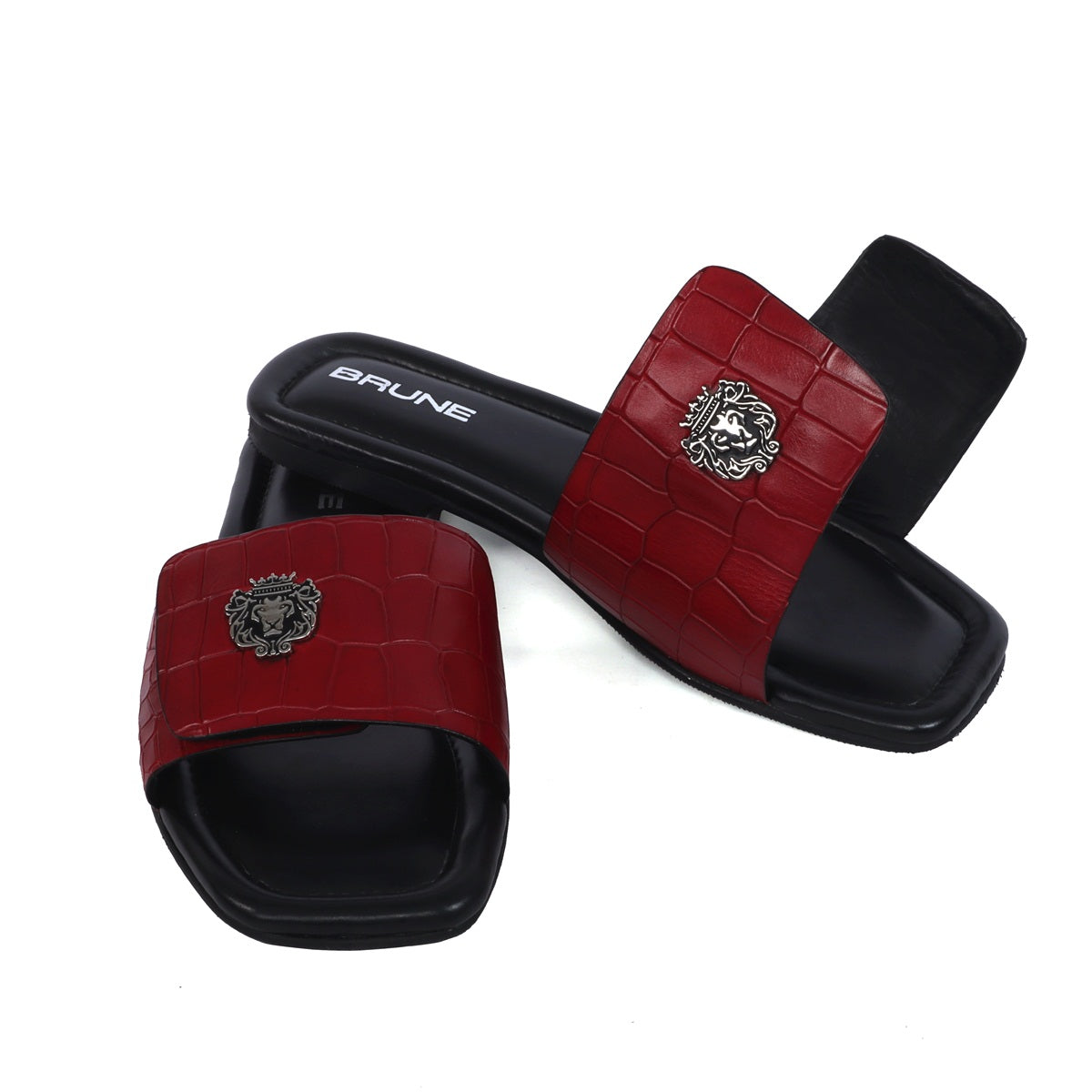 The croco deep cut textured leather slide in slipper from Brune & Bareskin is perfect for those who seek a stylish yet comfortable shoe. Featuring a Velcro adjustable strap, silver lion logo, and handmade wine finish, this slipper is both lightweight and soft, making it ideal for all-day wear. Anti-Skid rubber outer sole ensures the perfect walking grip. Carry these with Jeans, Shorts and other casual wears to be style leader. You can get it made in your favorite color with our Bespoke services.
