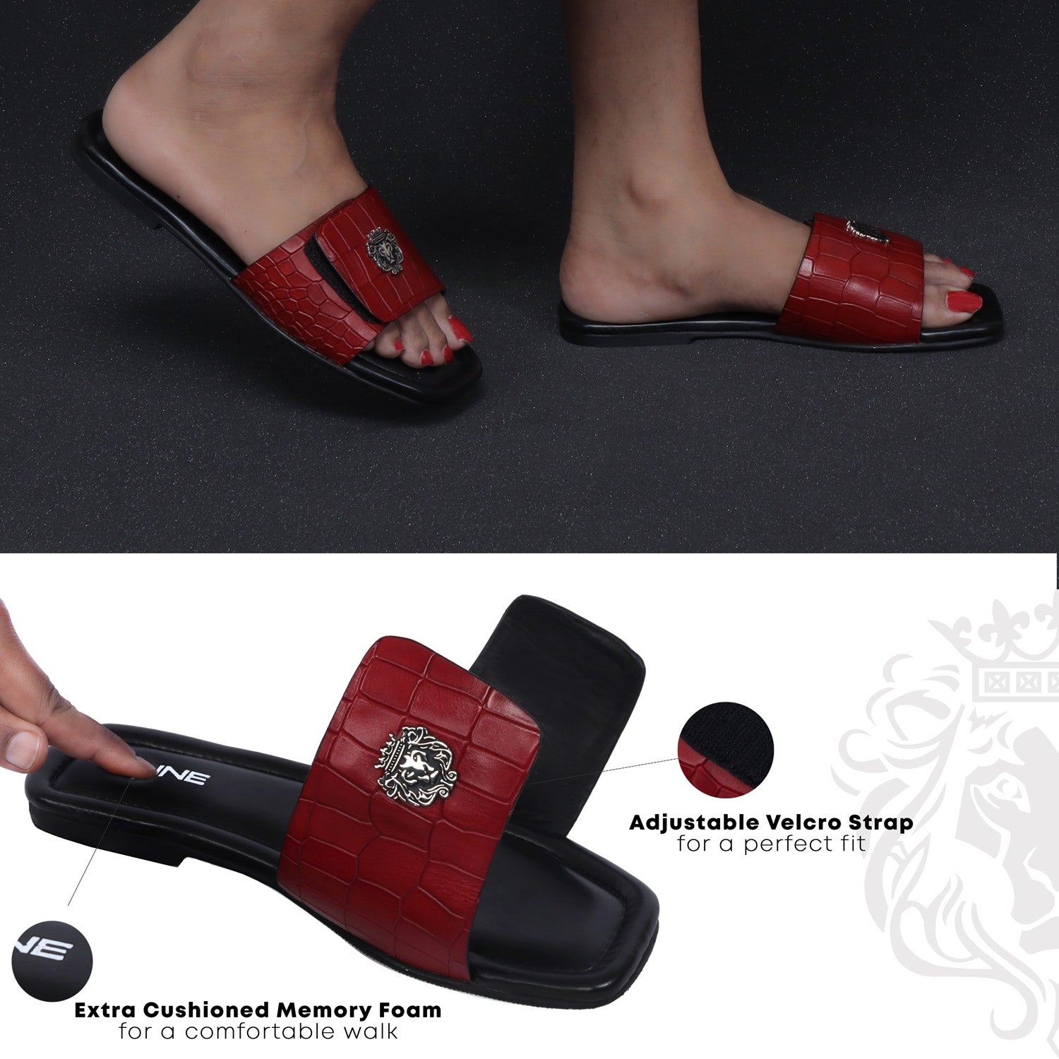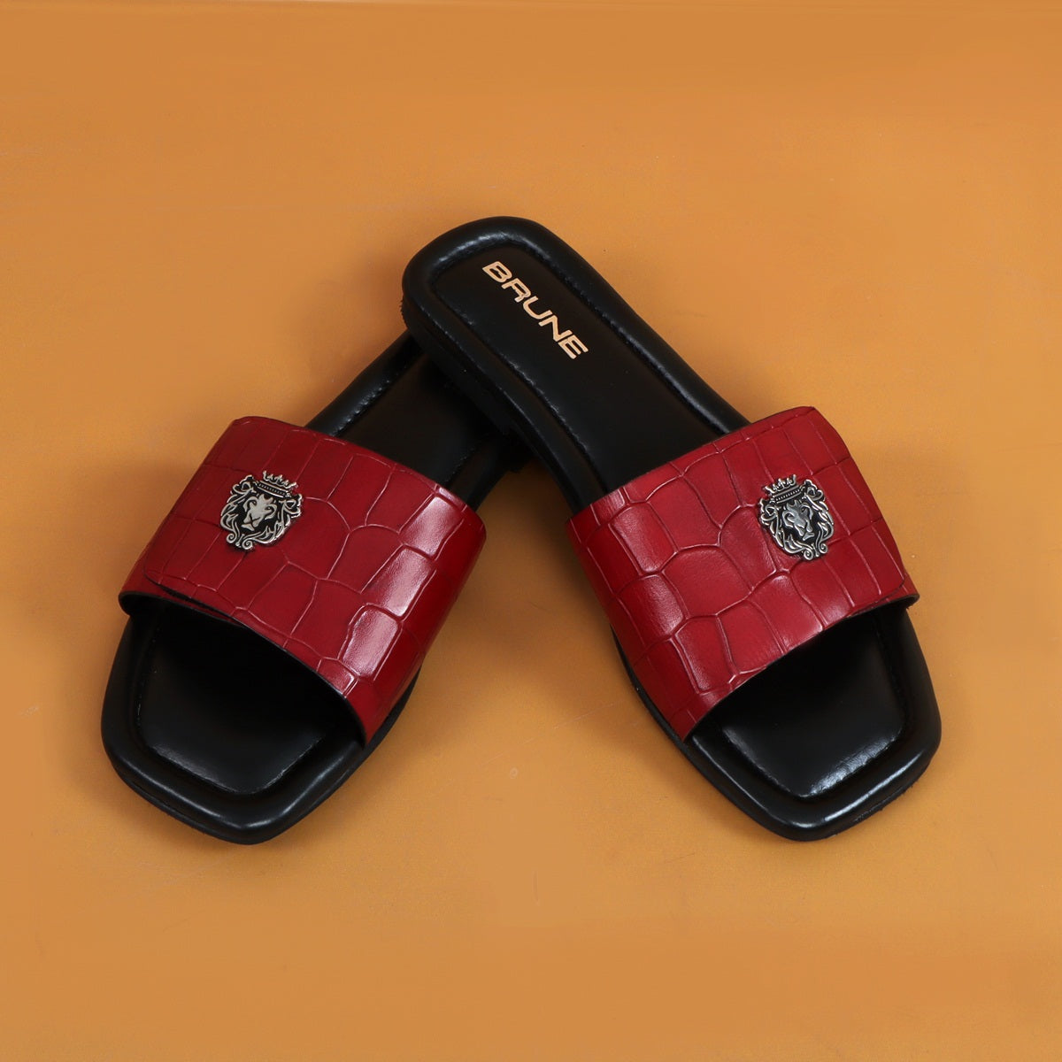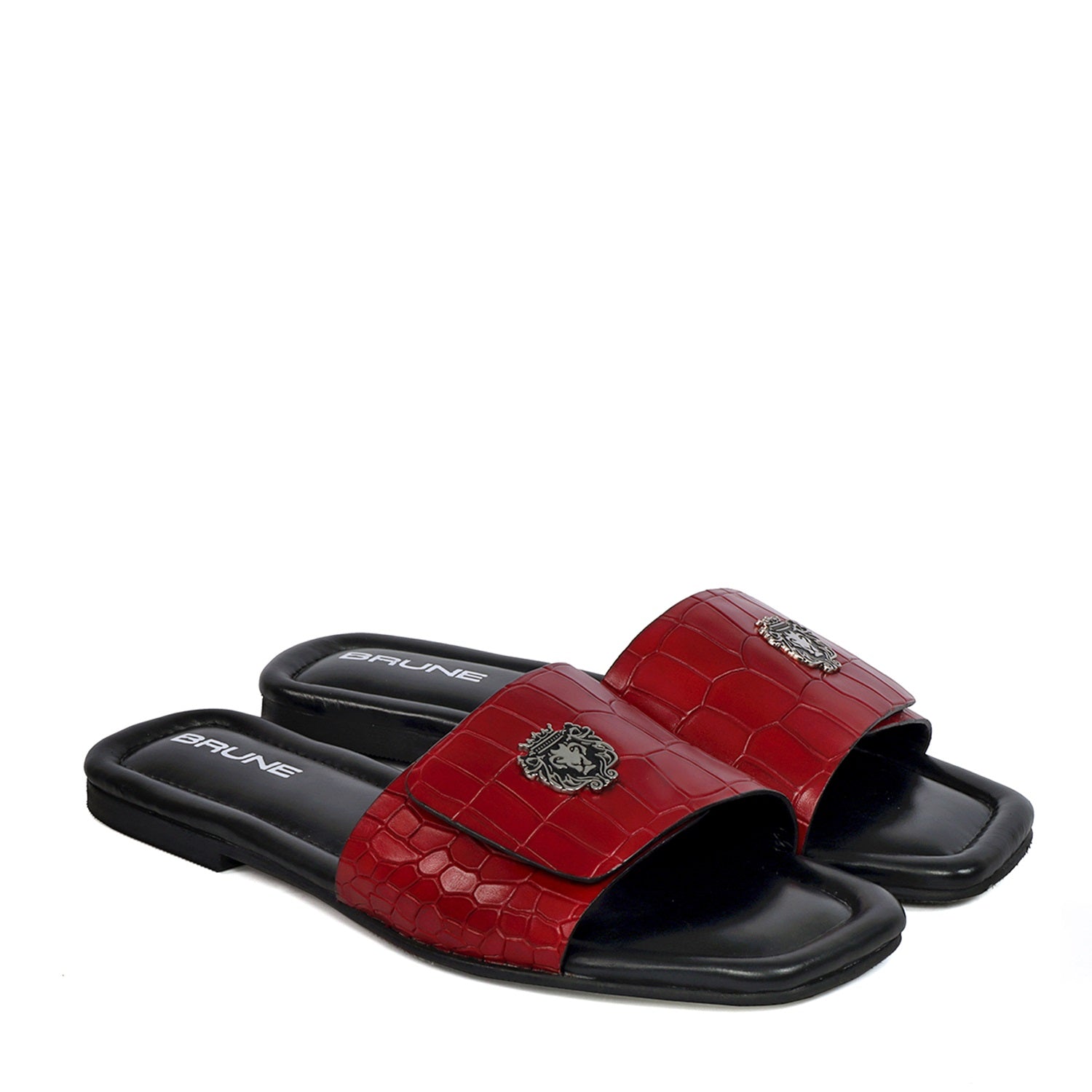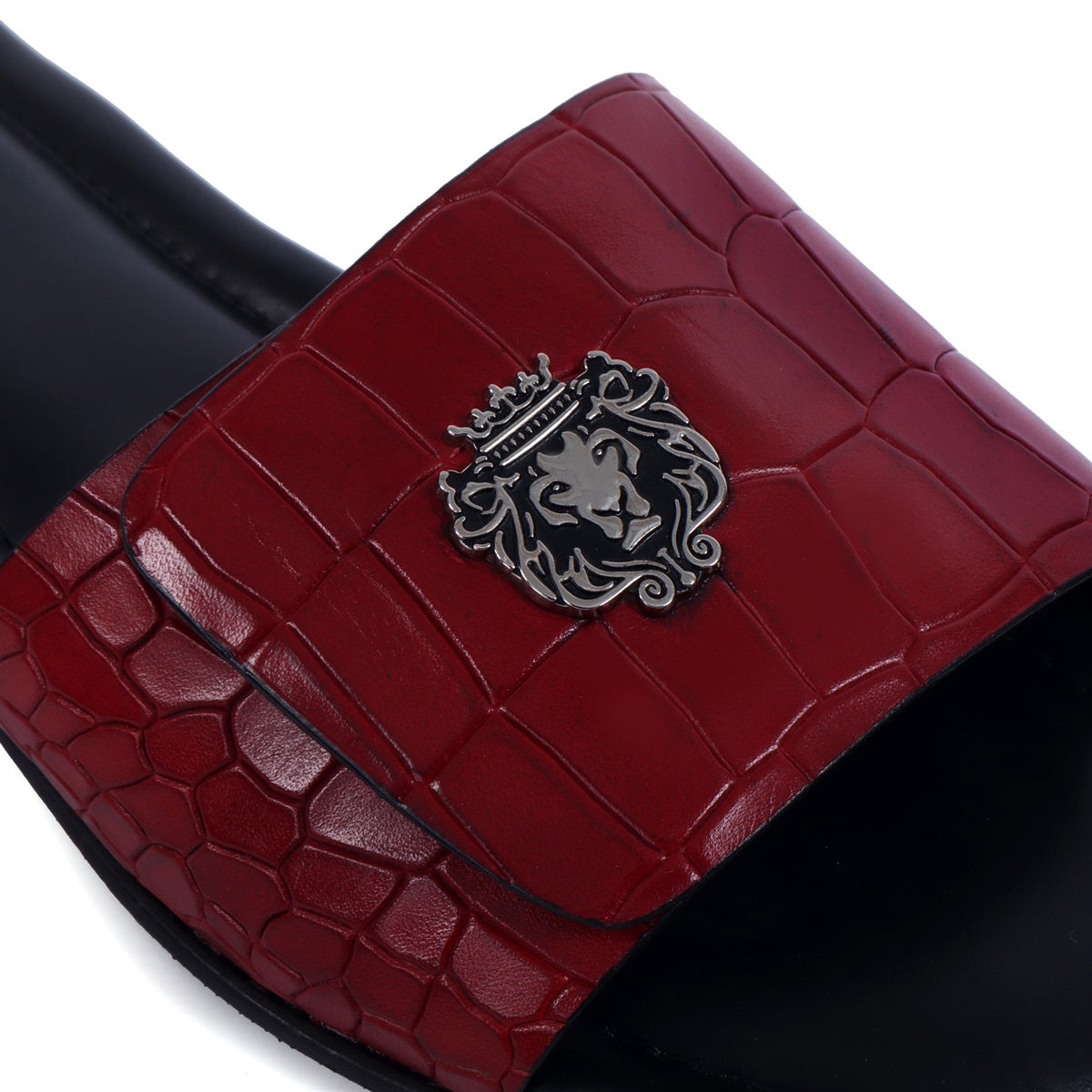 The croco deep cut textured leather slide in slipper from Brune & Bareskin is perfect for those who seek a stylish yet comfortable shoe. Featuring a Velcro adjustable strap, silver lion logo, and handmade wine finish, this slipper is both lightweight and soft, making it ideal for all-day wear. Anti-Skid rubber outer sole ensures the perfect walking grip. Carry these with Jeans, Shorts and other casual wears to be style leader. You can get it made in your favorite color with our Bespoke services.