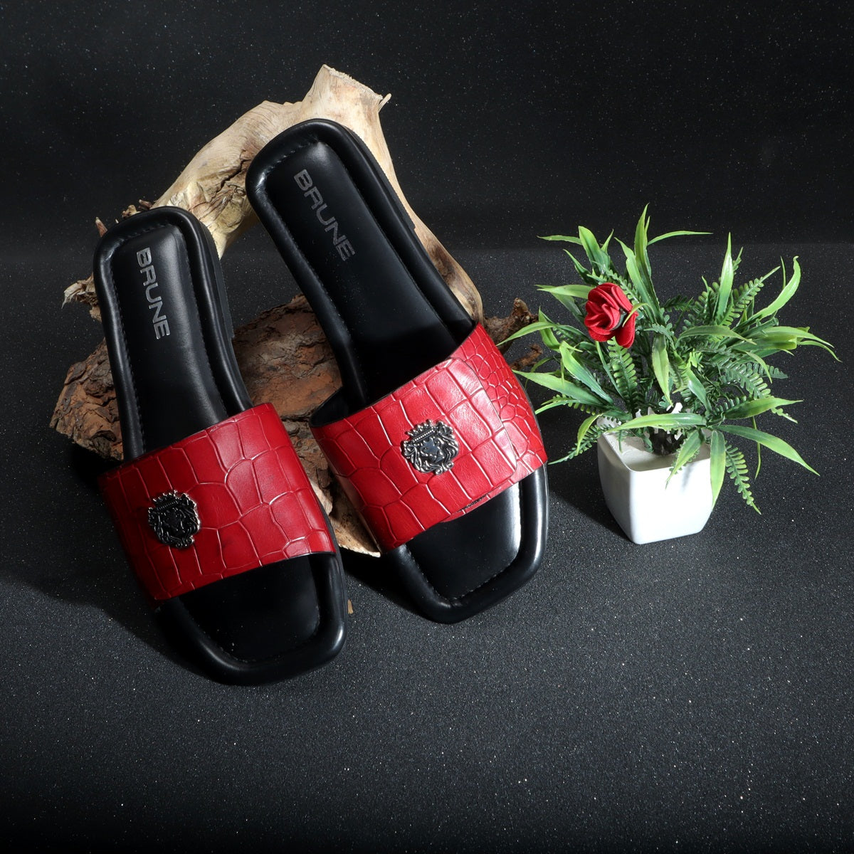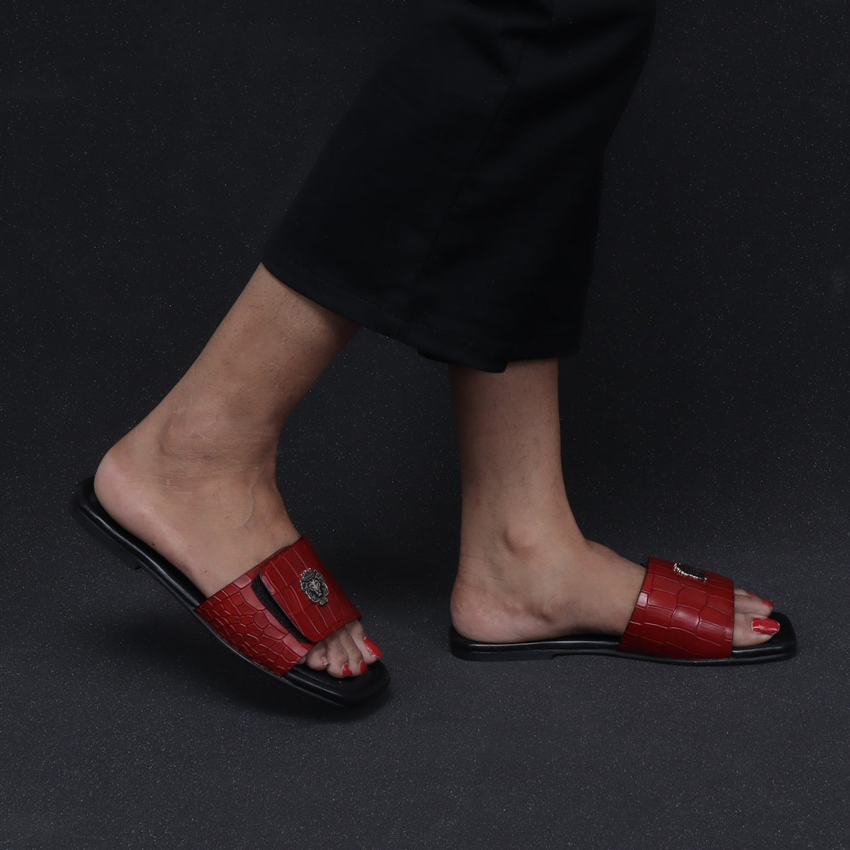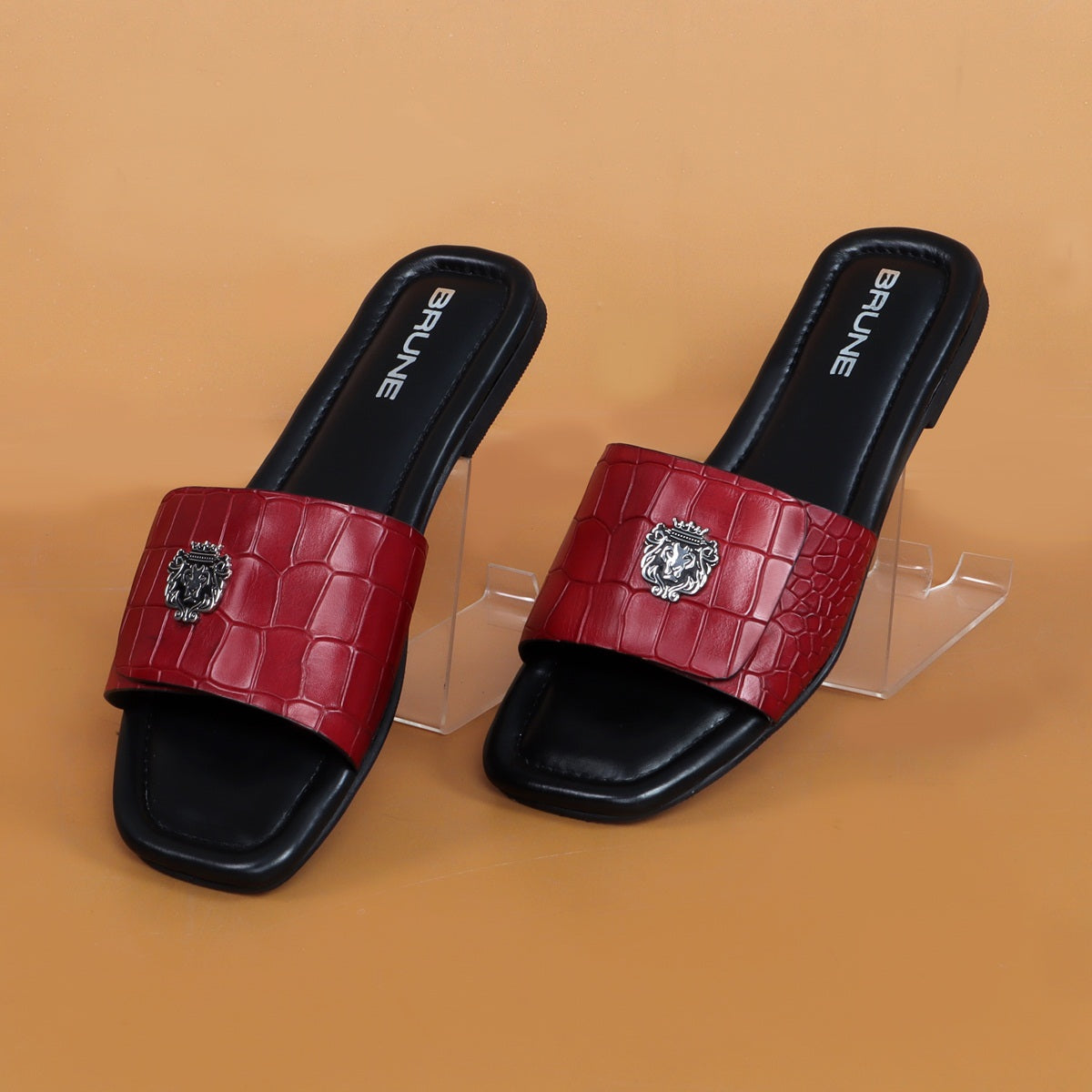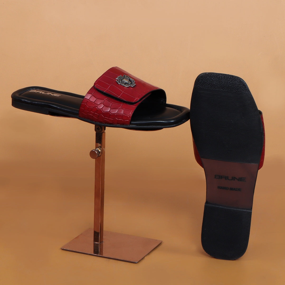 The croco deep cut textured leather slide in slipper from Brune & Bareskin is perfect for those who seek a stylish yet comfortable shoe. Featuring a Velcro adjustable strap, silver lion logo, and handmade wine finish, this slipper is both lightweight and soft, making it ideal for all-day wear. Anti-Skid rubber outer sole ensures the perfect walking grip. Carry these with Jeans, Shorts and other casual wears to be style leader. You can get it made in your favorite color with our Bespoke services.