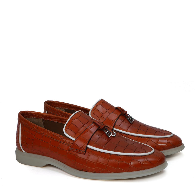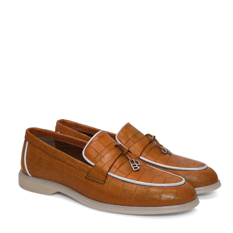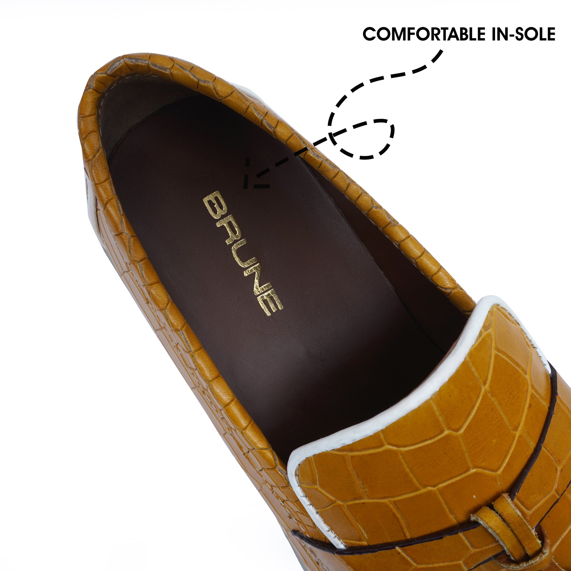 Stride confidently into the summer season with our Yellow Yacht Shoes. Crafted with a deep cut croco textured leather and hand-colored yellow finish, these designer shoes are a perfect combination of comfort and style. Complete with a durable anti-skid rubber sole and tasseled with metal initial, these men's Loafers from brand Brune & Bareskin are a must-have for any adventurer.