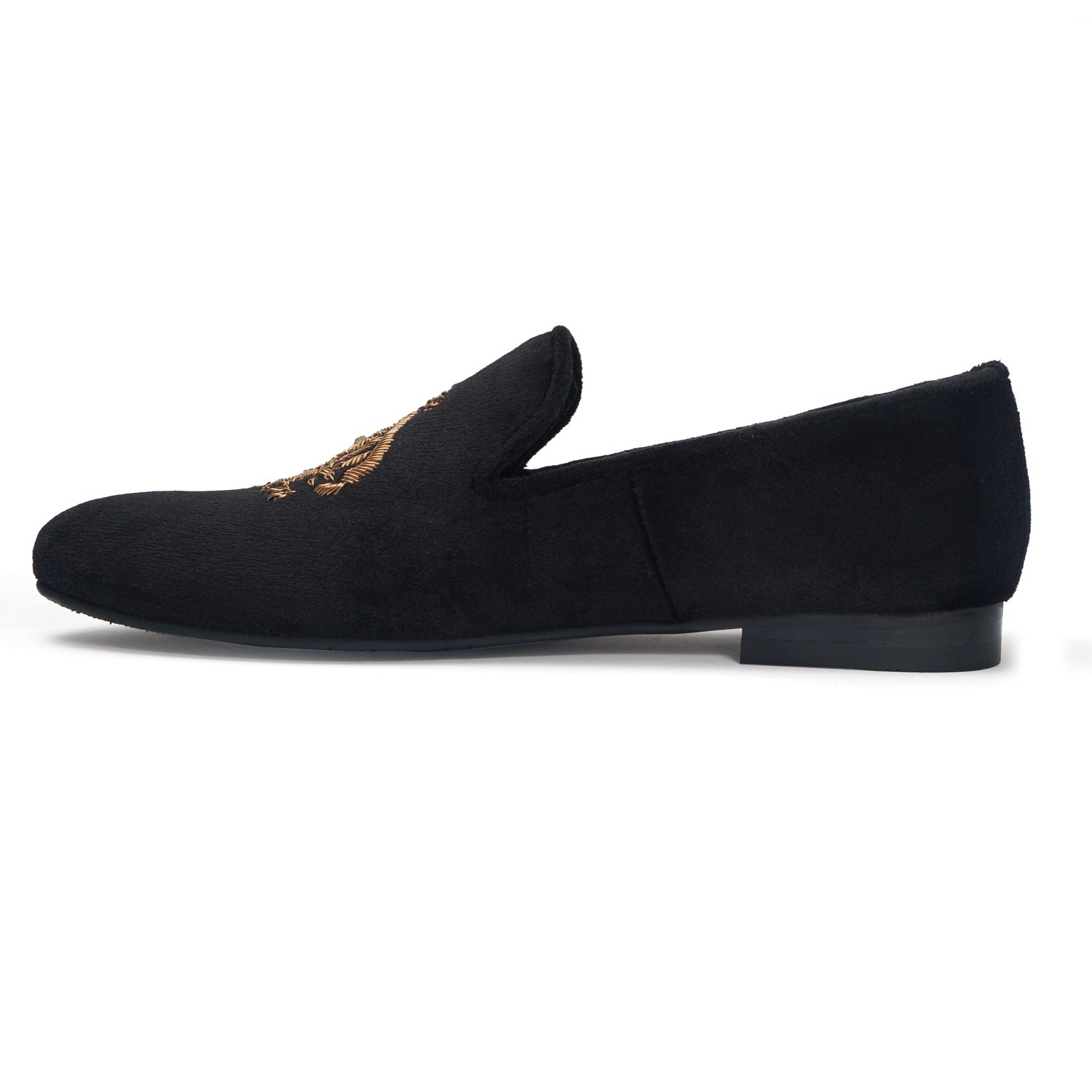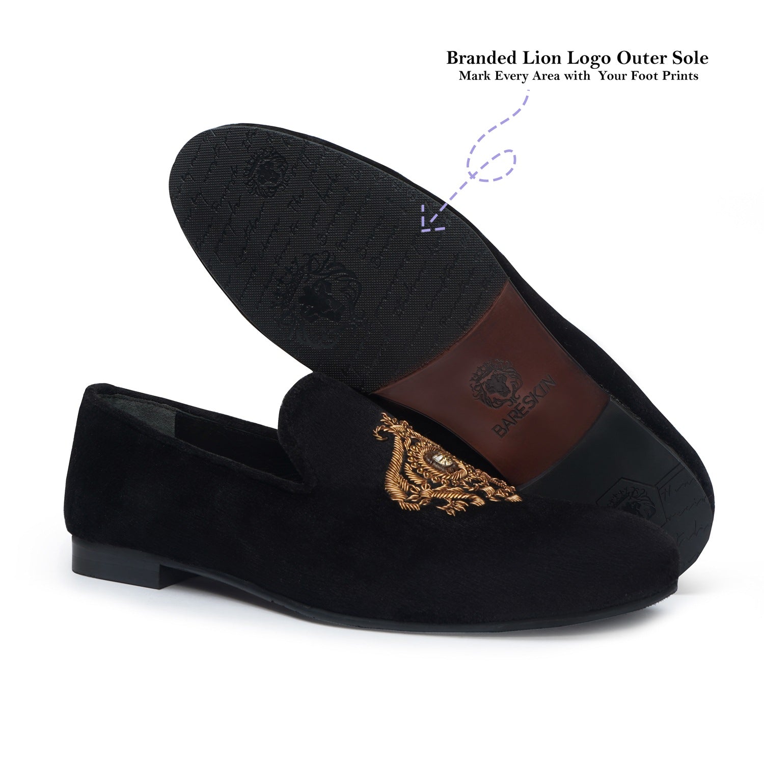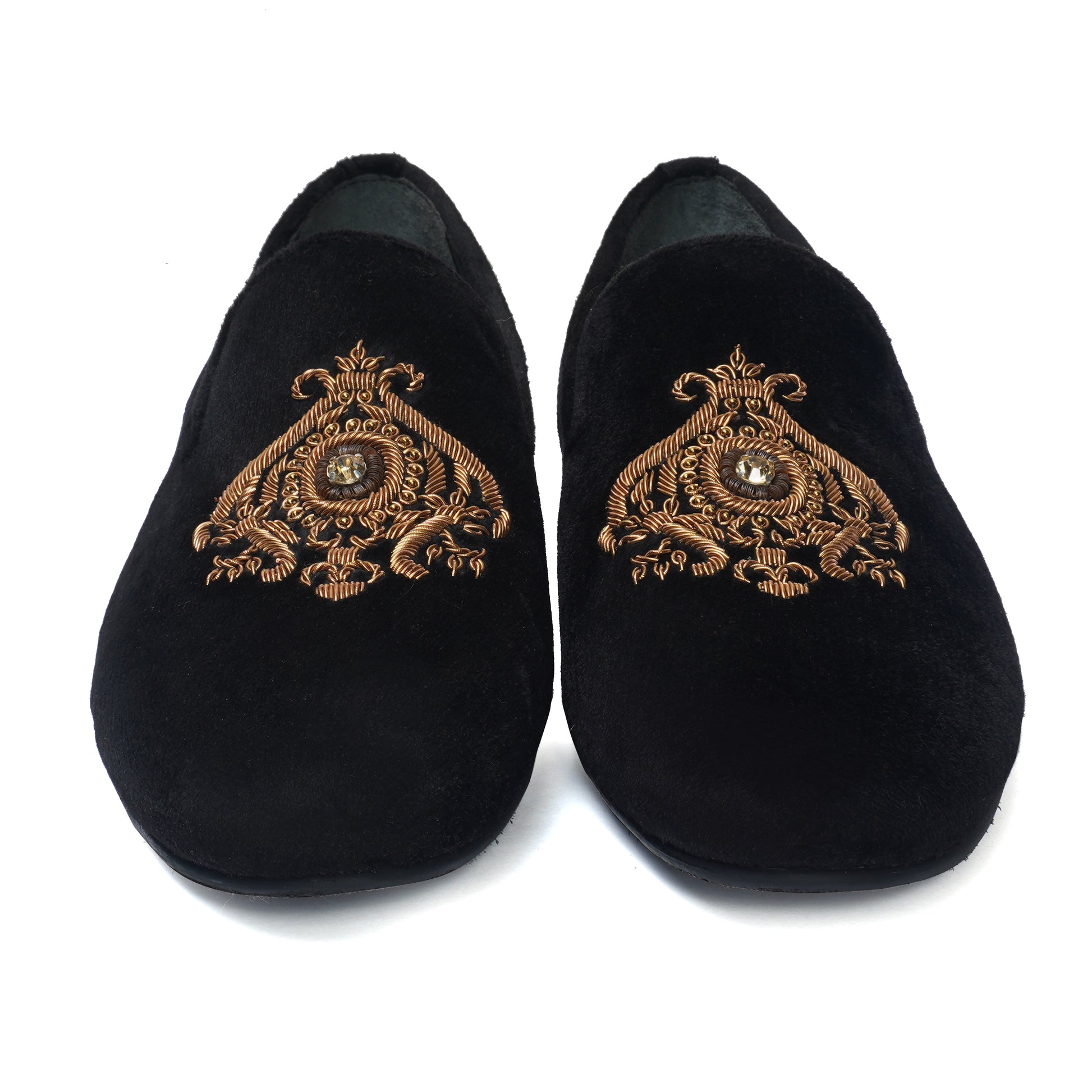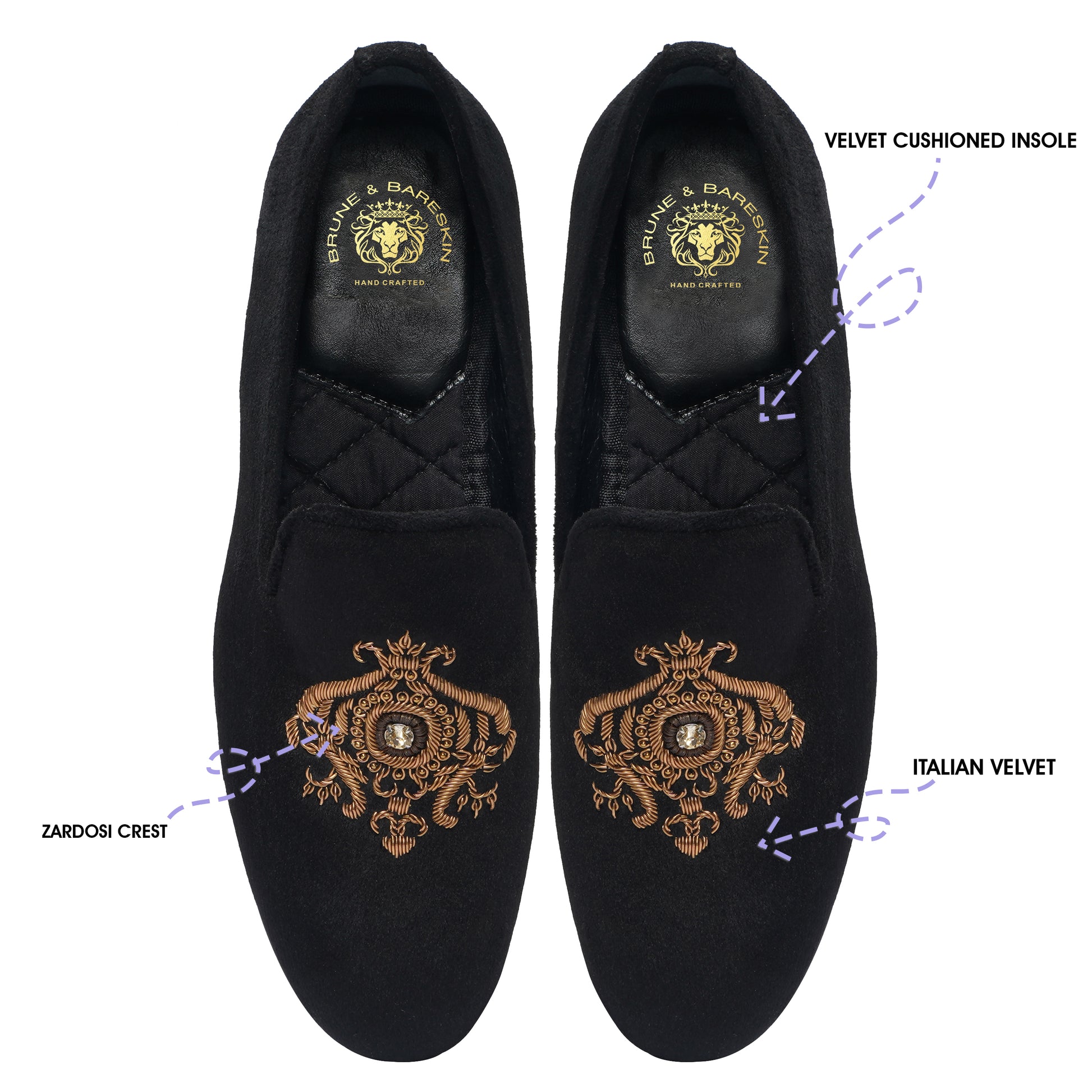 Look sharp and feel comfortable all day long with these black Italian velvet slip-on shoes from Brune & Bareskin. Handmade with expertly crafted copper zardosi crest, these shoes boast high quality materials and a classy look. The soft and cushioned insole, along with the laser engraved anti-skid rubber sole, promises great comfort and completes any formal outfit. Perfect for weddings and special occasions.