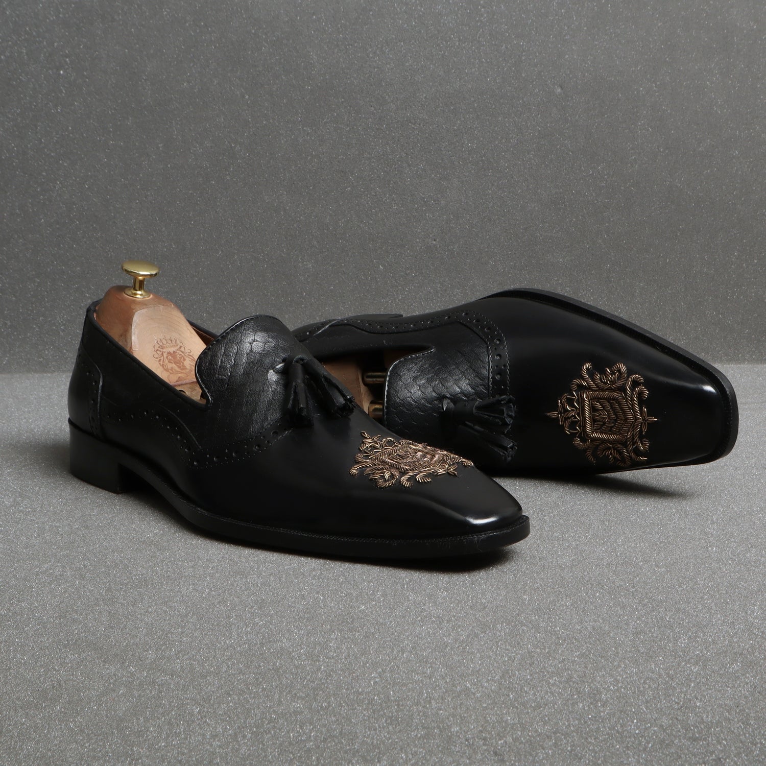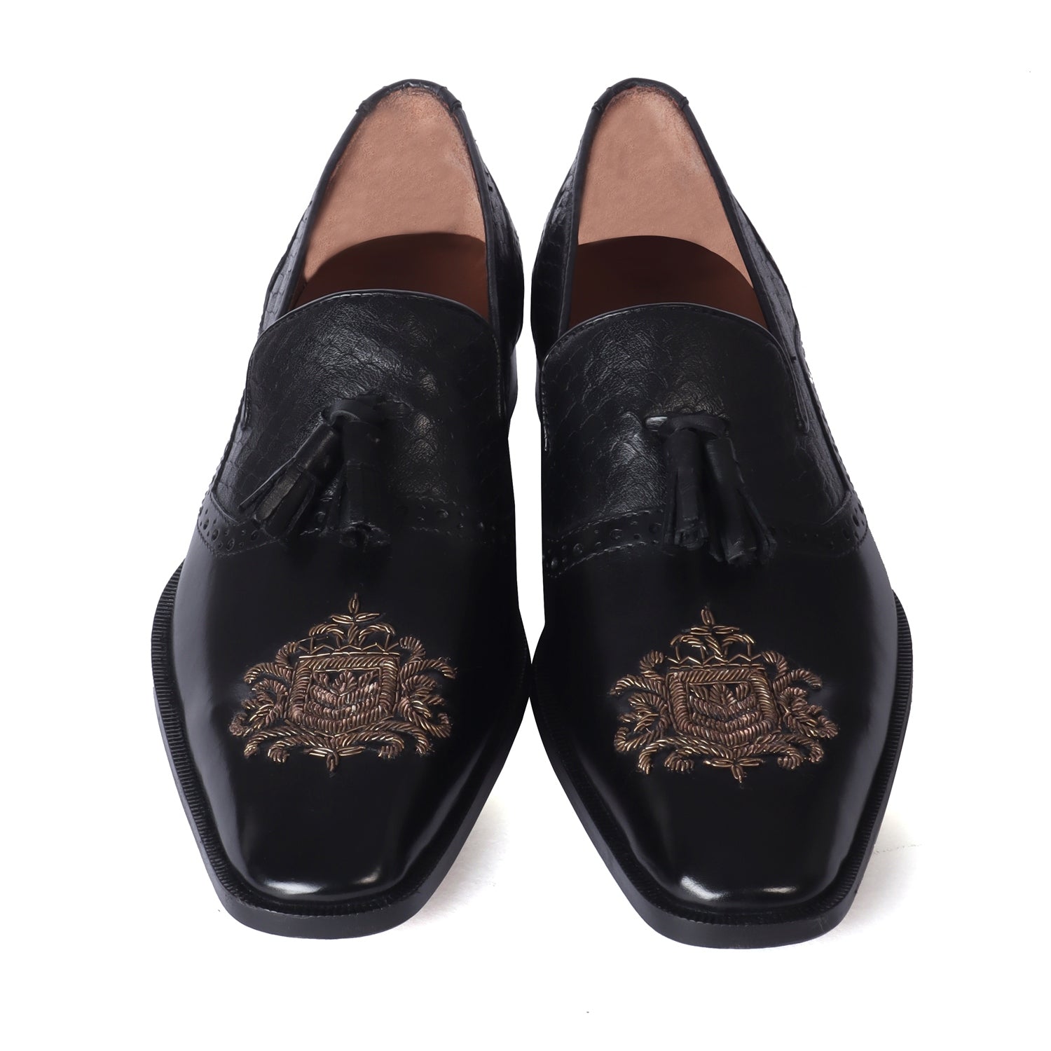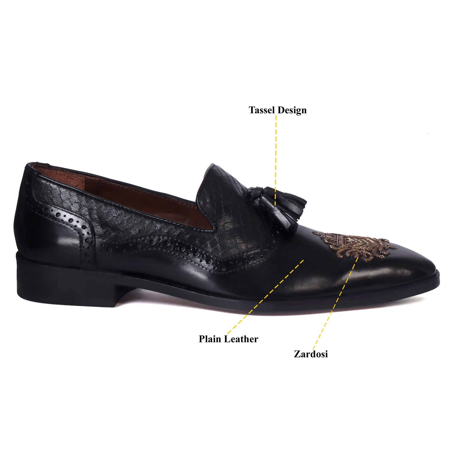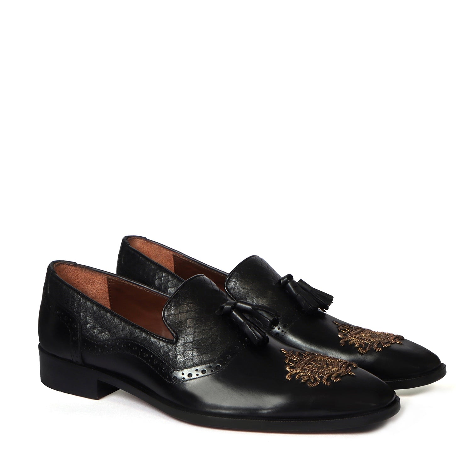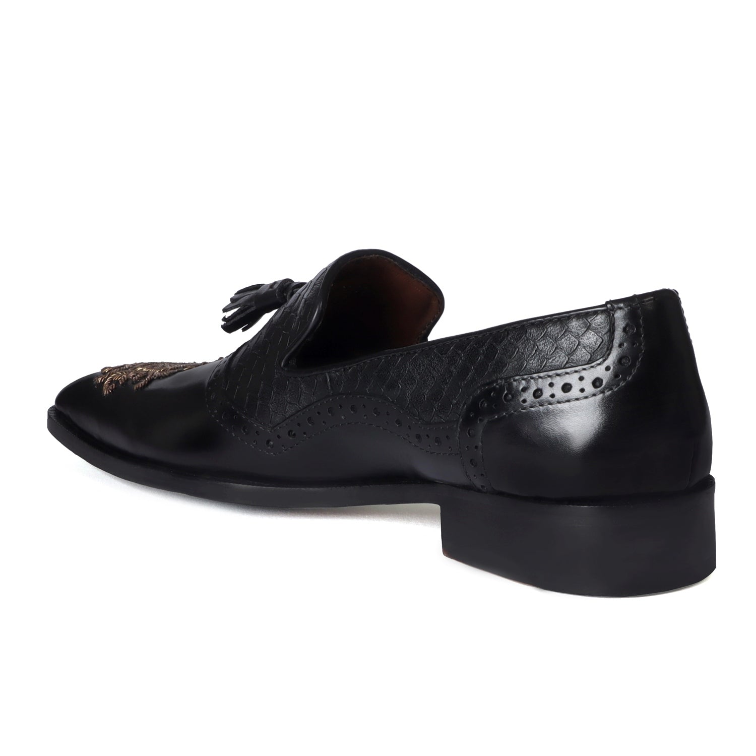 Zardosi Toe Slip-On Shoe For Men Black Snake Textured Tassel Leather