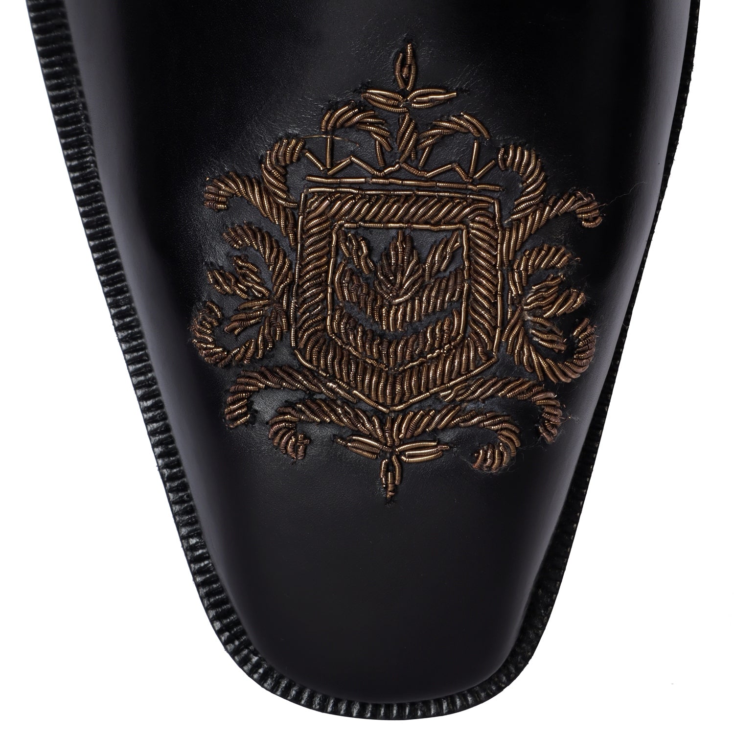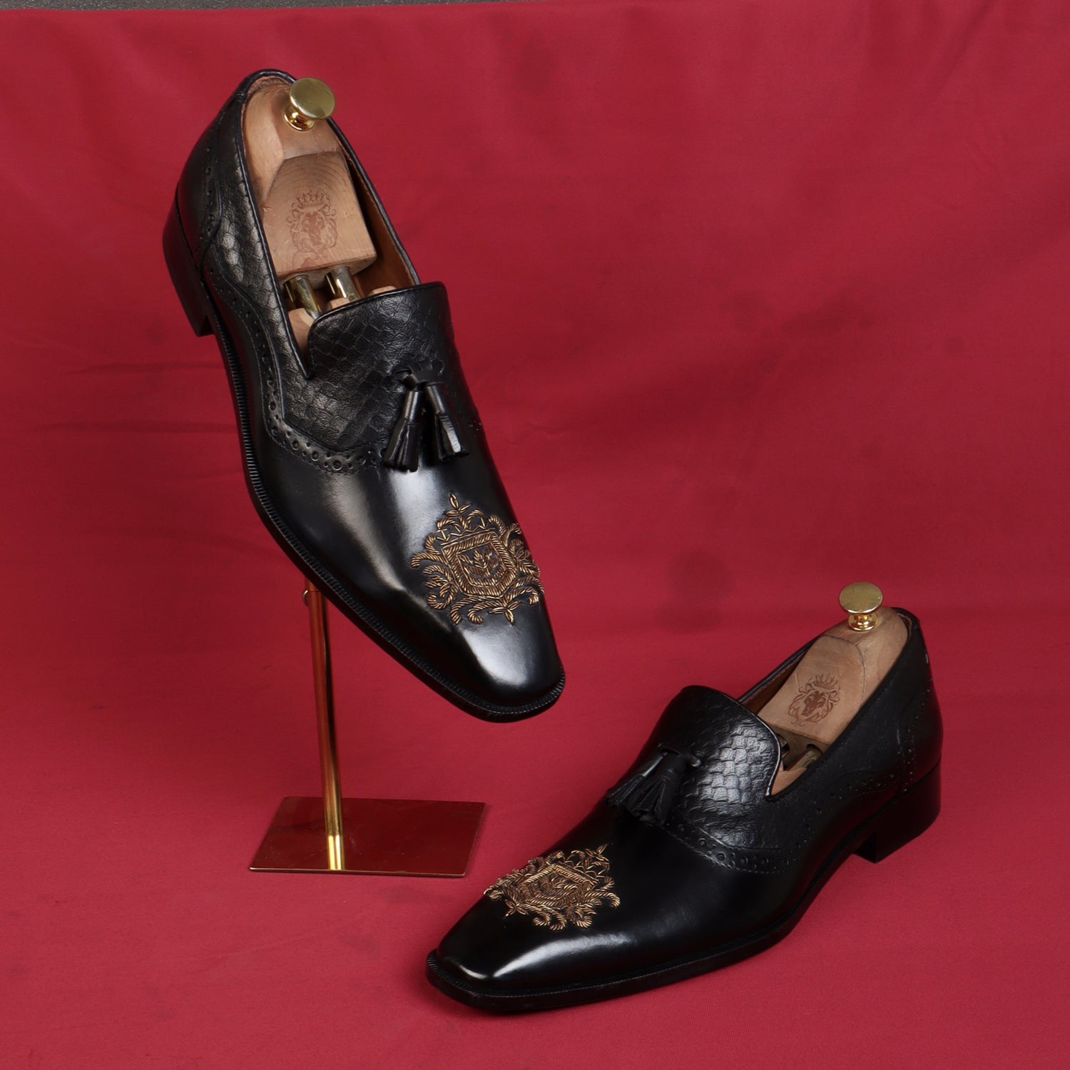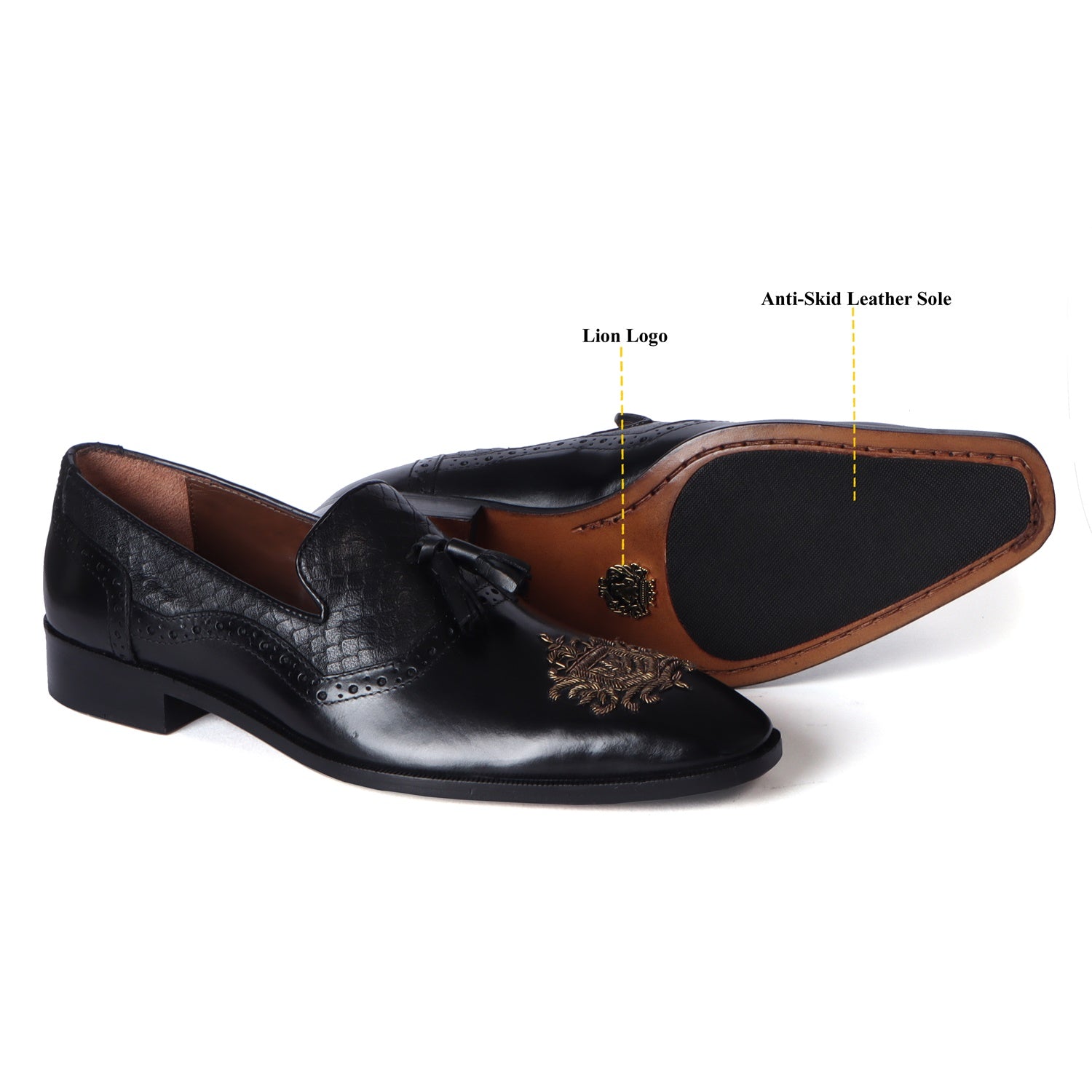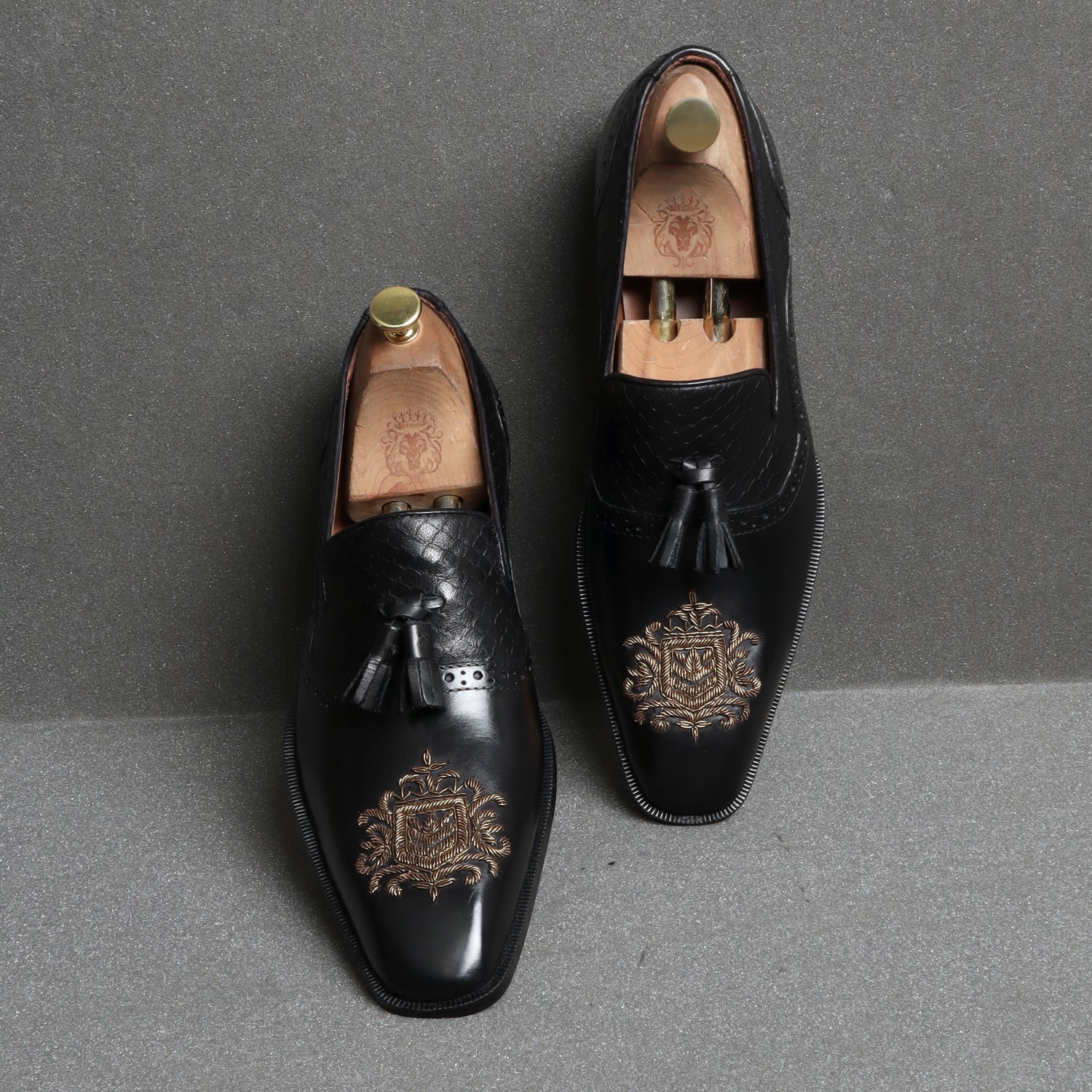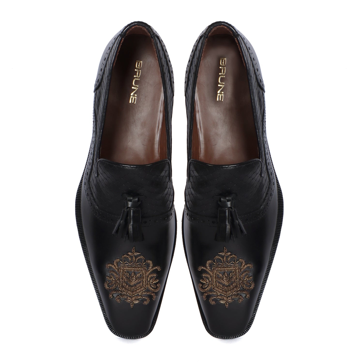 Zardosi Toe Slip-On Shoe For Men Black Snake Textured Tassel Leather