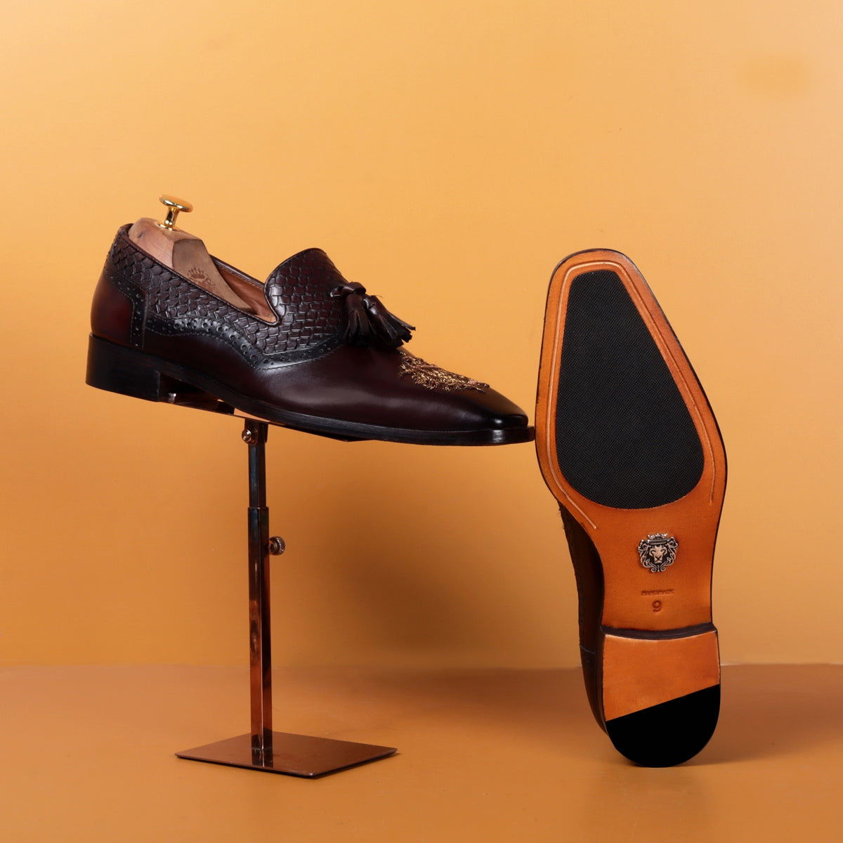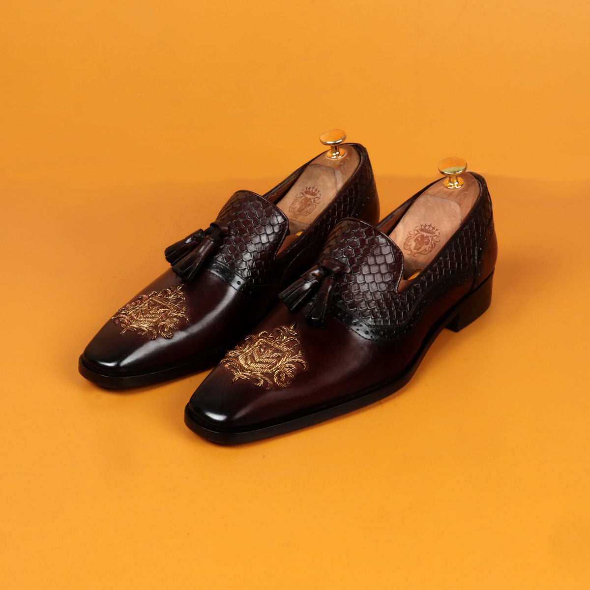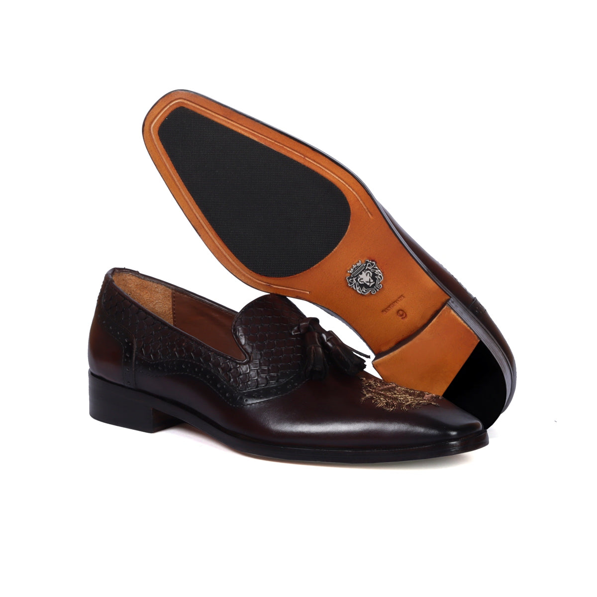 Zardosi Toe Dark Brown Snake Textured Tassel Leather Slip-On Shoe For Men