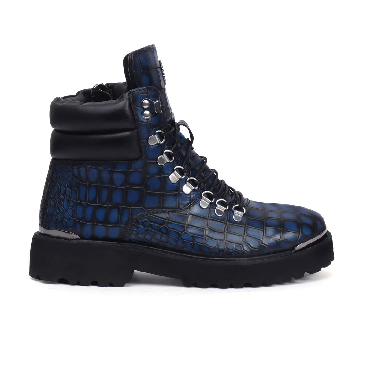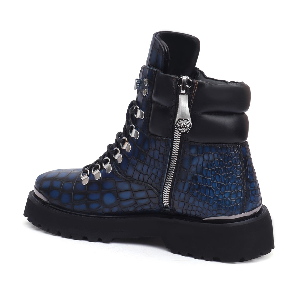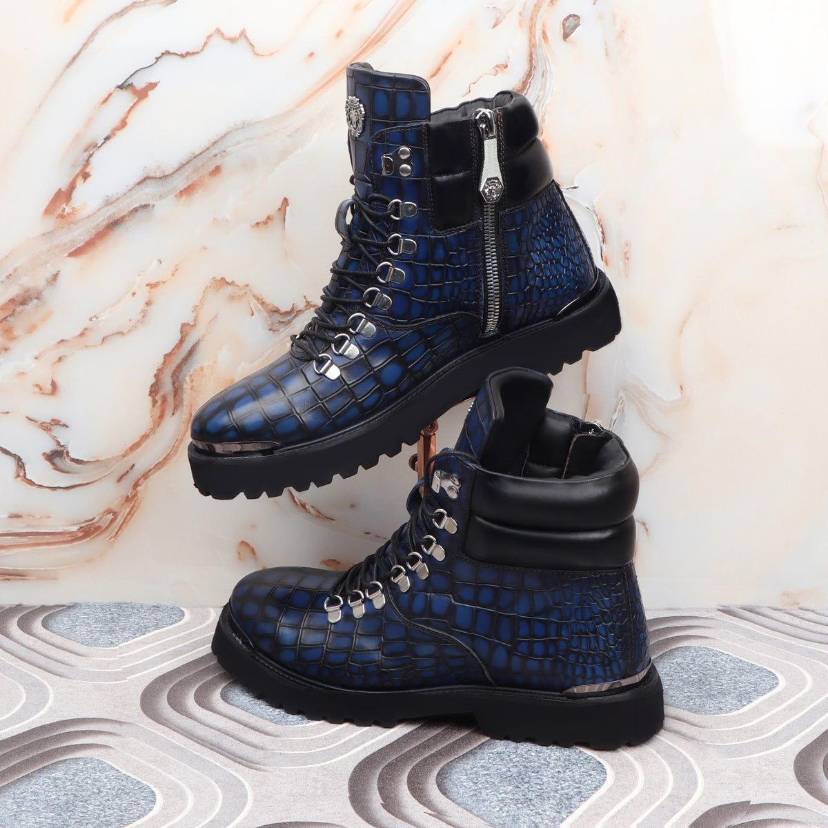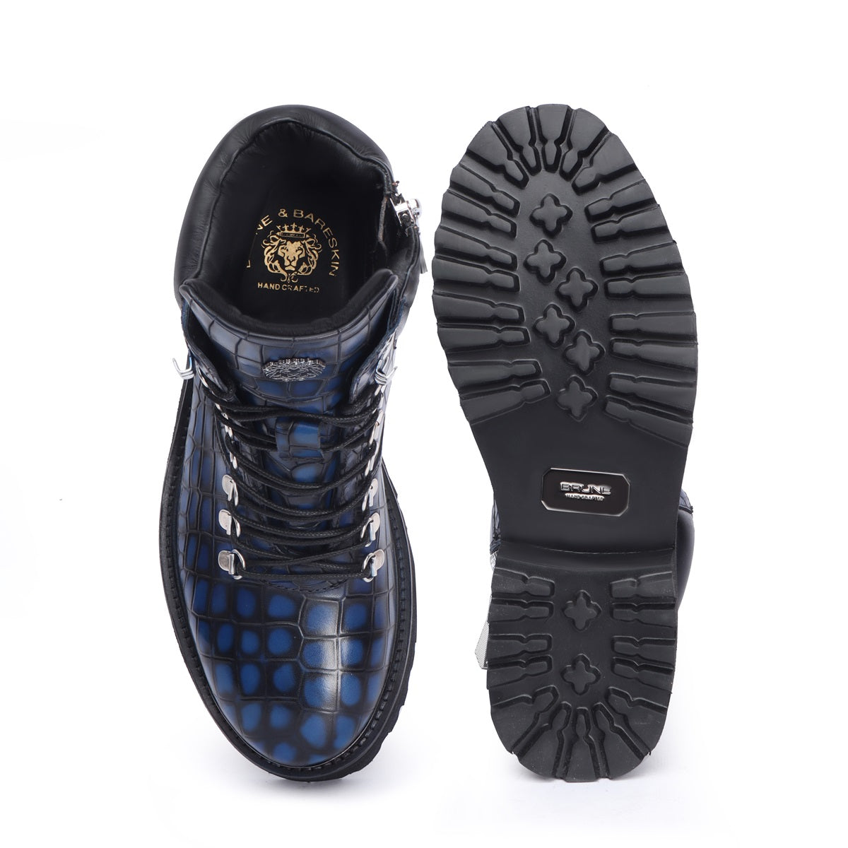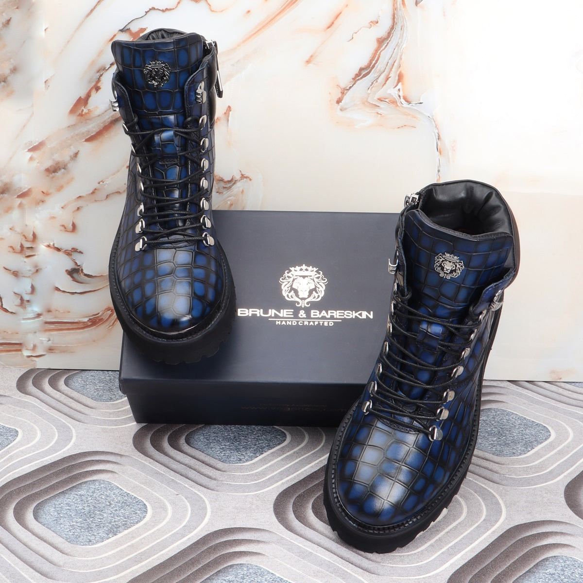Hand-Painted Smokey Blue Deep Cut Croco Leather Brune & Bareskin Boots are crafted to provide the utmost comfort and next-level style. It is a perfect pair to carry on long travels. Smokey Finish Deep Cut Croco shoe looks lavishing with metal shoe eyelets and Brune & Bareskin's signature metal lion logo. The metal plates on the toe and ankle provide more rigidity and oomph to it. The long zip on the internal side make it very easy to wear these. These ankle-length shoes are fitted that emphasize the size and shape of your feet to perfection. They are easy to team with formal trousers as they blend well with the classic fabrics as well as the modern fabric pants, slacks, cargos, and trousers. You can make a travel combo with a matching Leather bag and jacket.