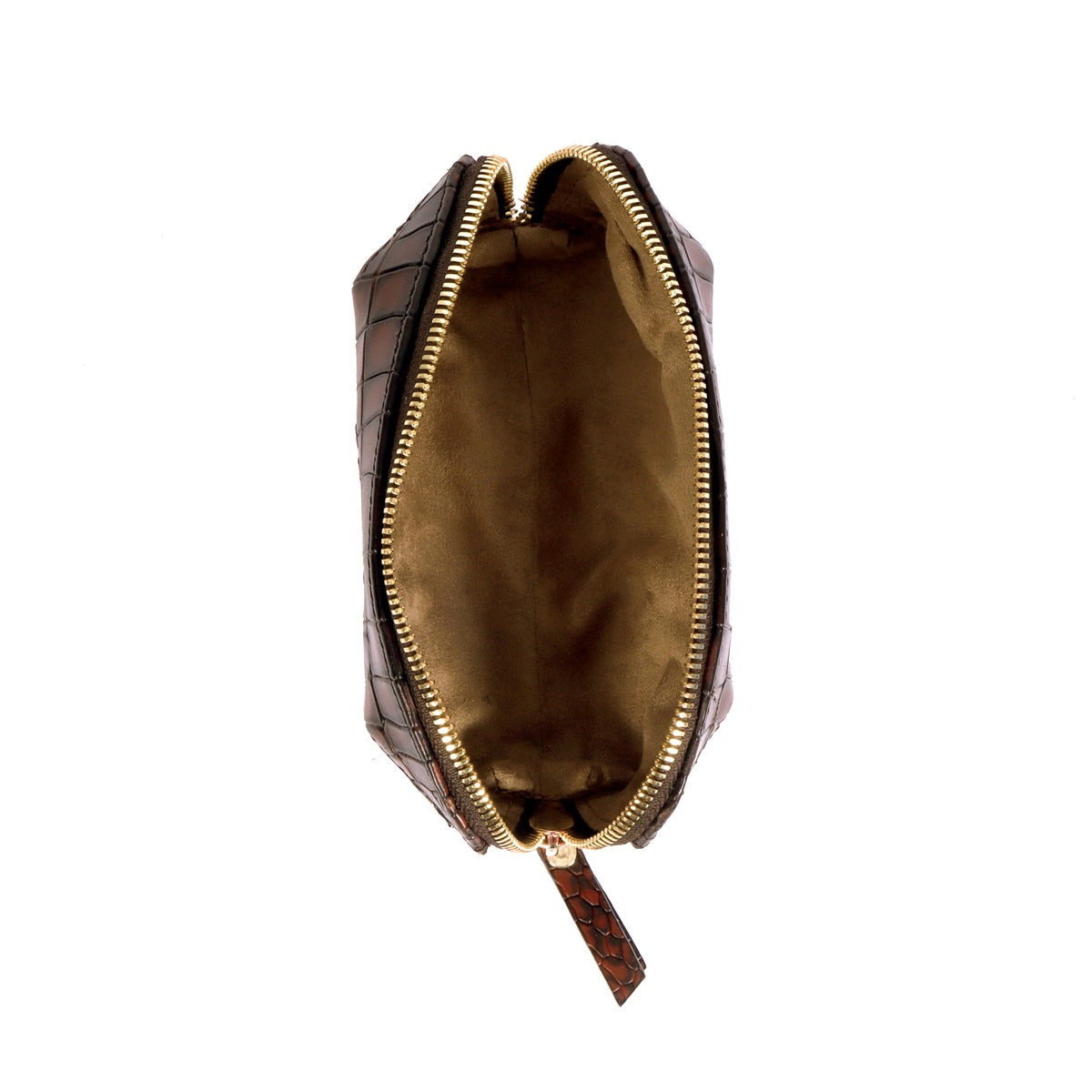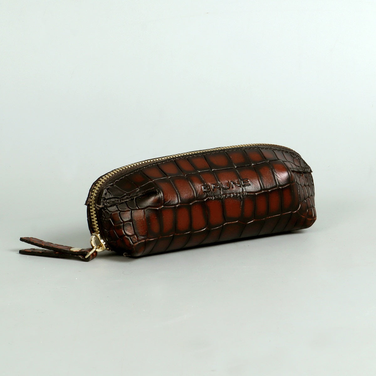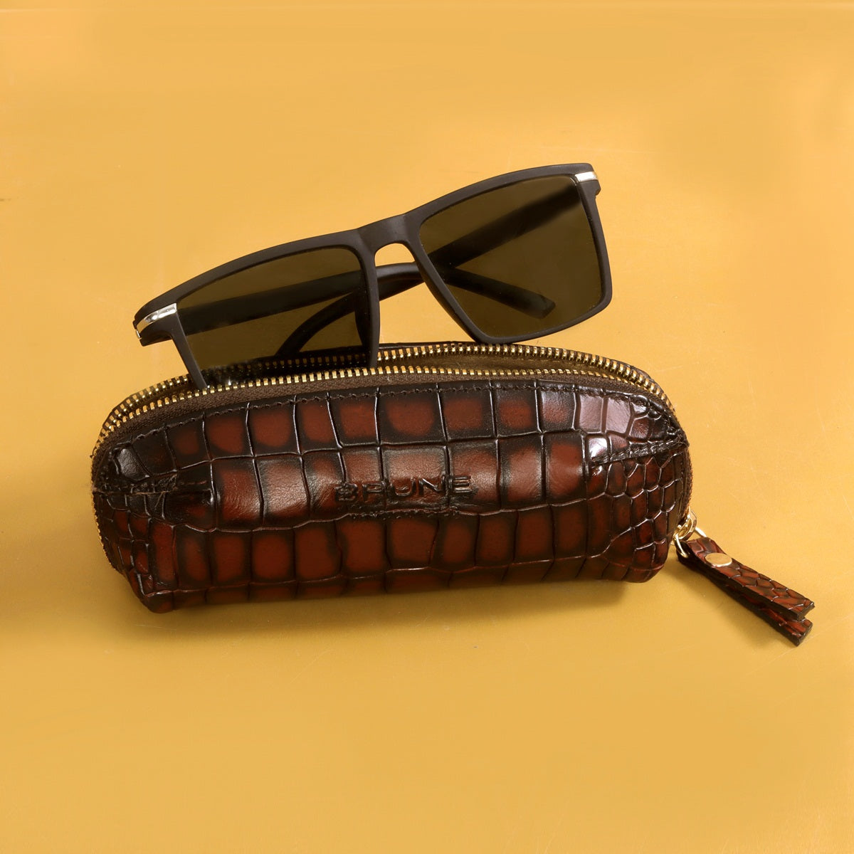 Elevate the look of your eyewear with Brune & Bareskin espresso leather eyewear glasses cover. Crafted with a smooth zip closure, this cover features a deep cut croco textured leather with a smoky finish and golden finish zip. Boasting protection and portability, its handmade construction is embossed with the Brune logo. Delightfully sophisticated and exclusive, this cover adds a touch of luxe to any accessory set. You can get it made in any color shade you want along with the name initials with our Bespoke Service.
