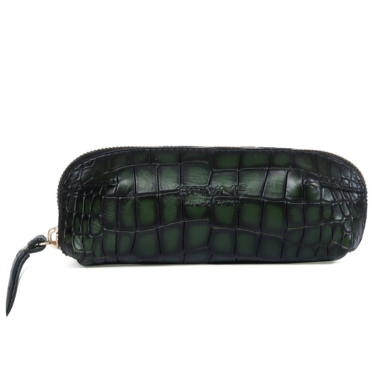 Elevate the look of your eyewear with Brune & Bareskin tan leather eyewear glasses cover. Crafted with a smooth zip closure, this cover features a deep cut croco textured leather with a smoky finish and golden finish zip. Boasting protection and portability, its handmade construction is embossed with the Brune logo. Delightfully sophisticated and exclusive, this cover adds a touch of luxe to any accessory set. You can get it made in any color shade you want along with the name initials with our Bespoke Service.